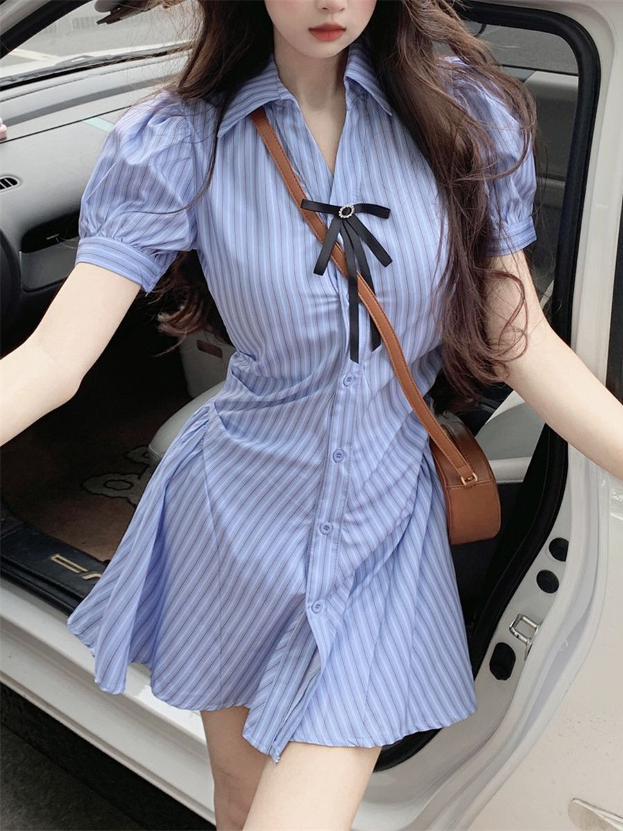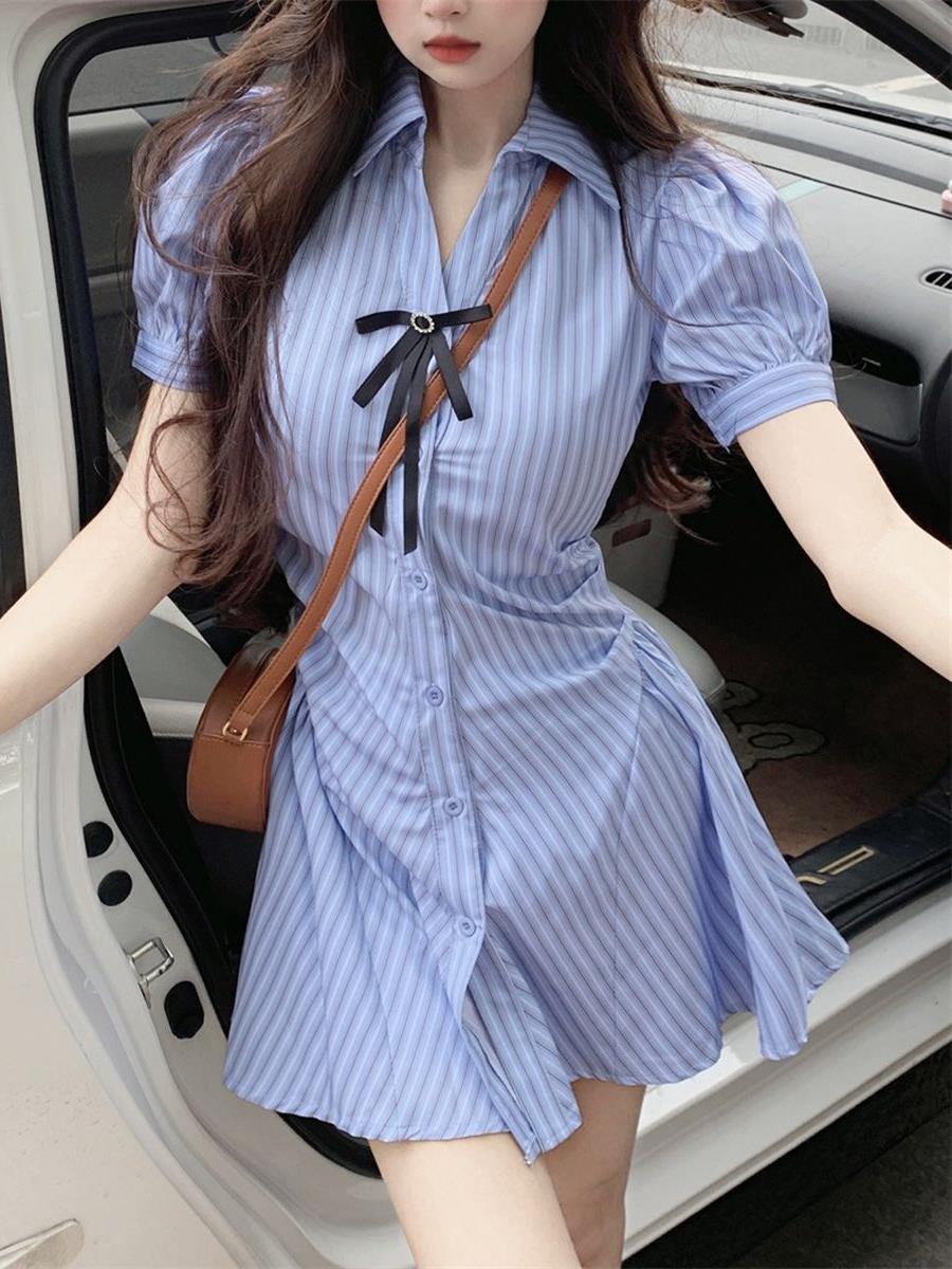学院风套装收腰显瘦裙子条纹衬衫连衣裙女夏季高腰短裤时尚两件套