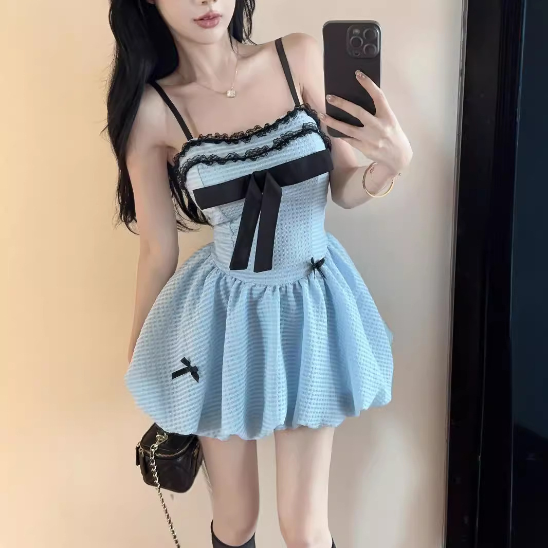气质蕾丝花边设计感吊带纯欲辣妹花苞裙修身显瘦收腰蝴蝶结连衣裙