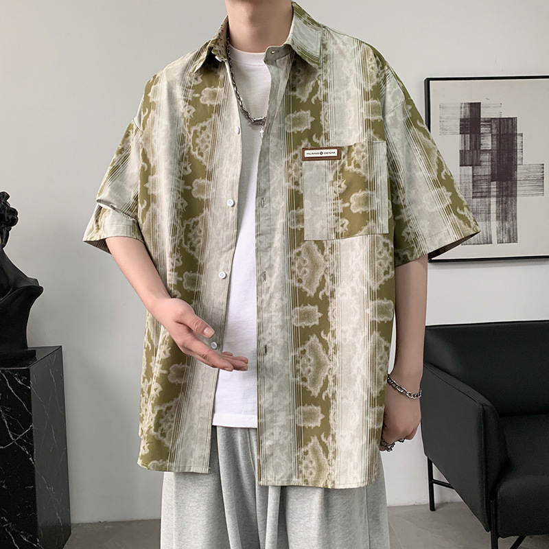 条纹休闲半袖衬衣港风日系小清新男士宽松短袖衬衫复古花衬衫夏季