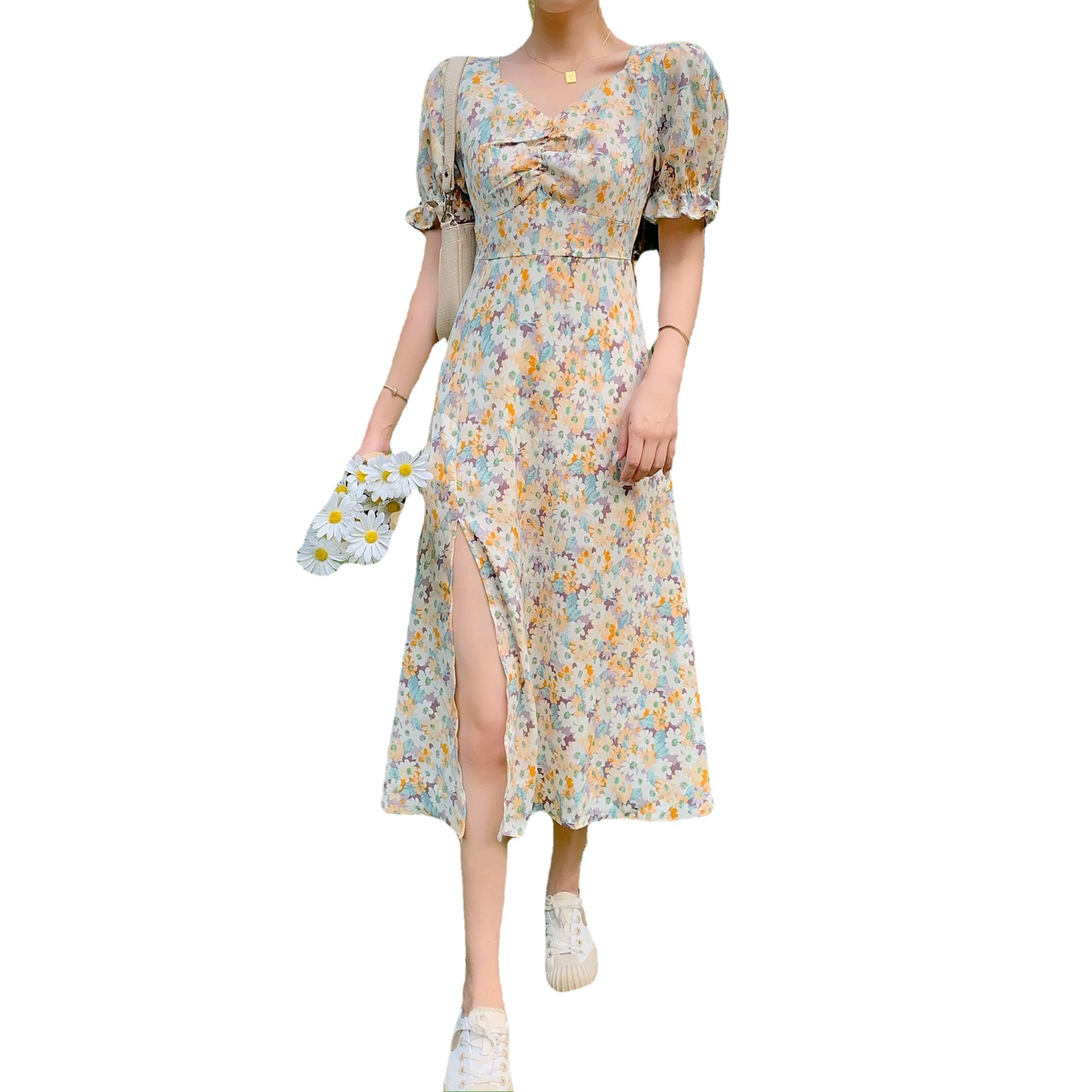 雪纺泡泡袖短袖v领碎花连衣裙女法式气质中长款印花开叉A字茶歇裙