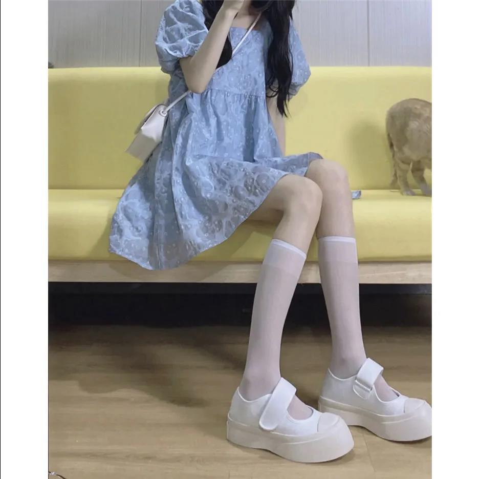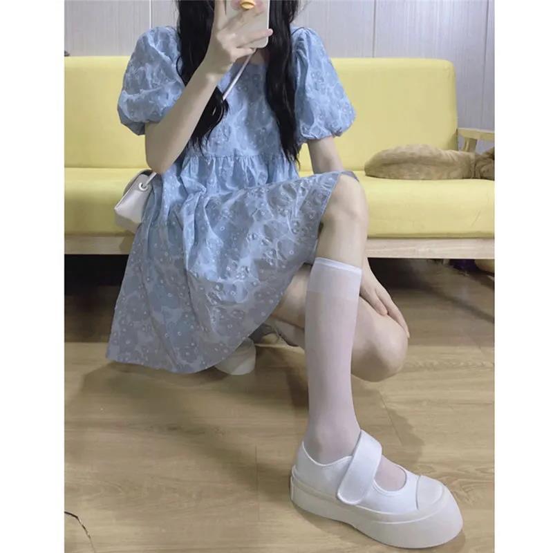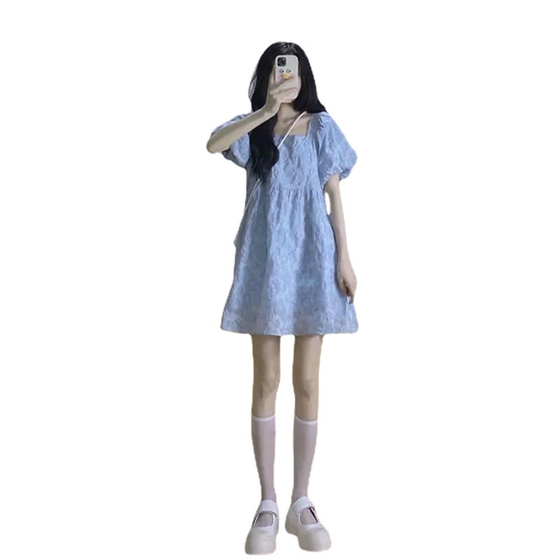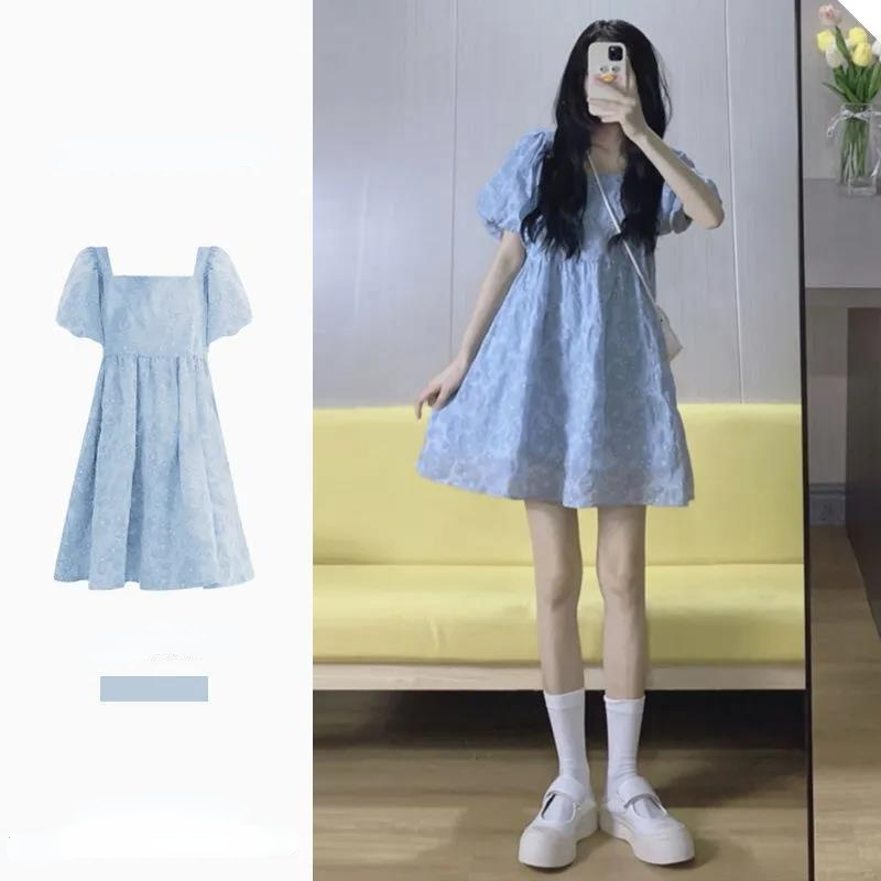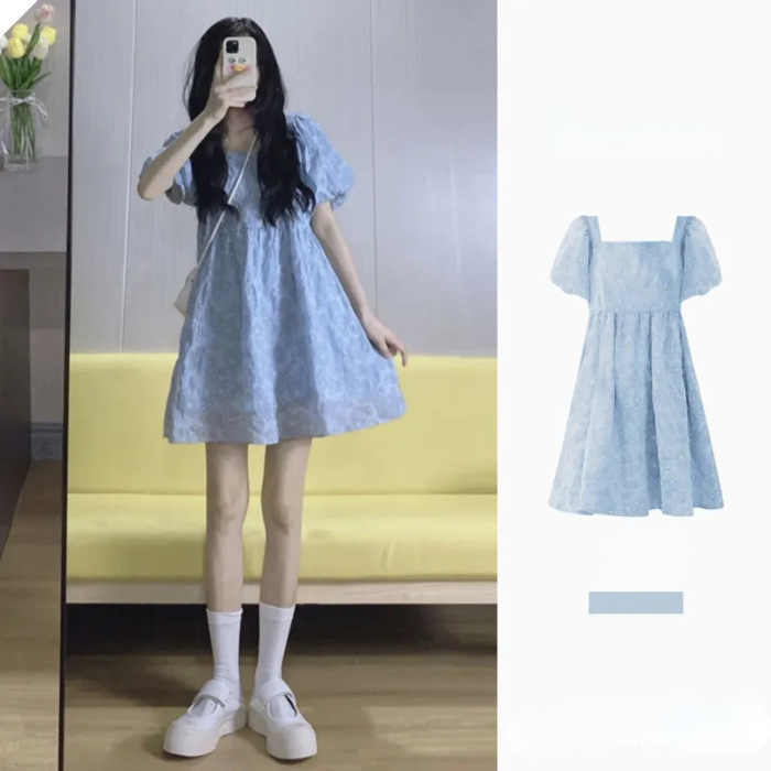 森系初恋裙小清新仙女方领日系泡泡袖蓬蓬裙公主小个子连衣裙