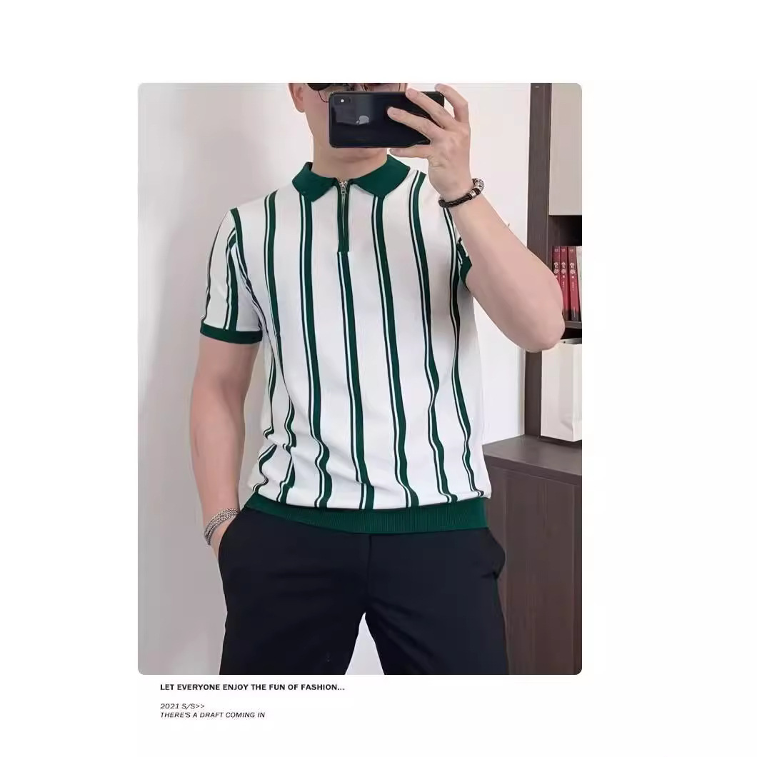 男装polo衫短袖薄款夏季翻领拉链上衣韩版条纹T恤透气商务短袖男