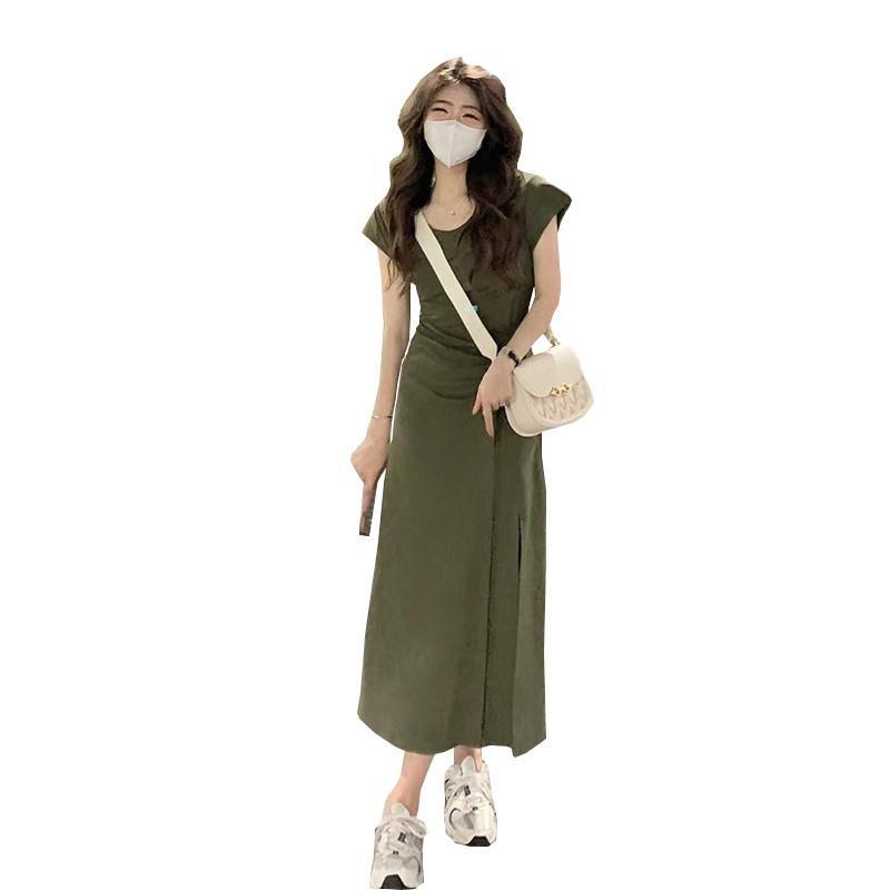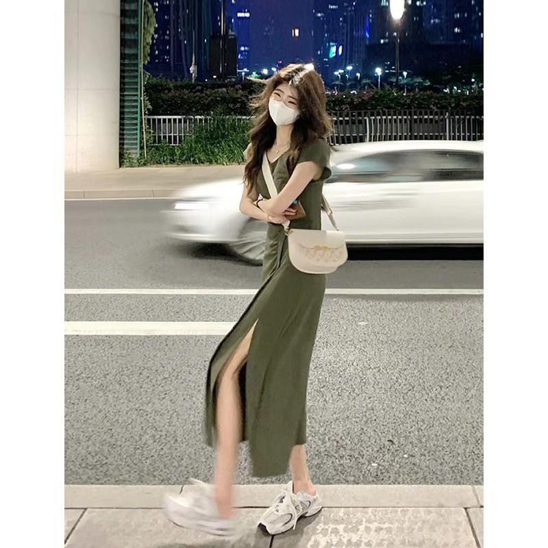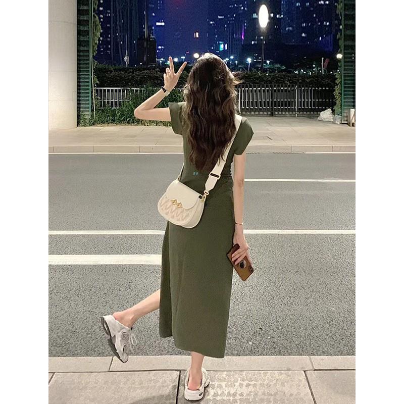 夏季新款女长裙法式质感高级感设计感小众收腰绿色连衣裙子