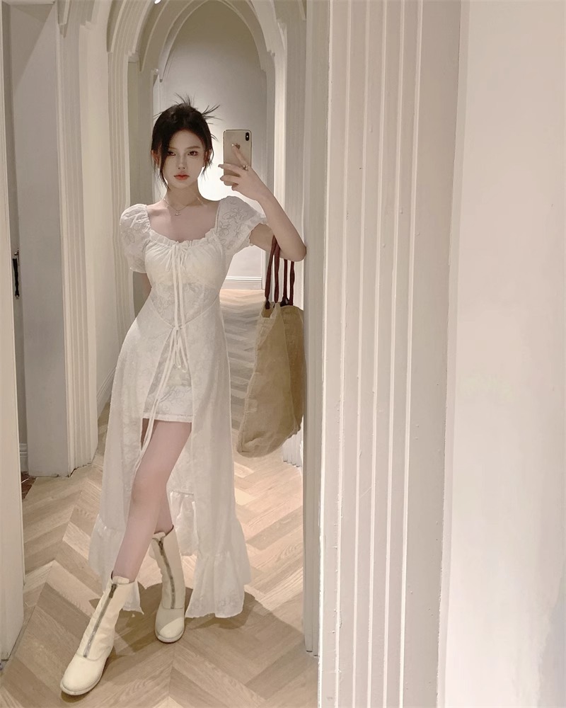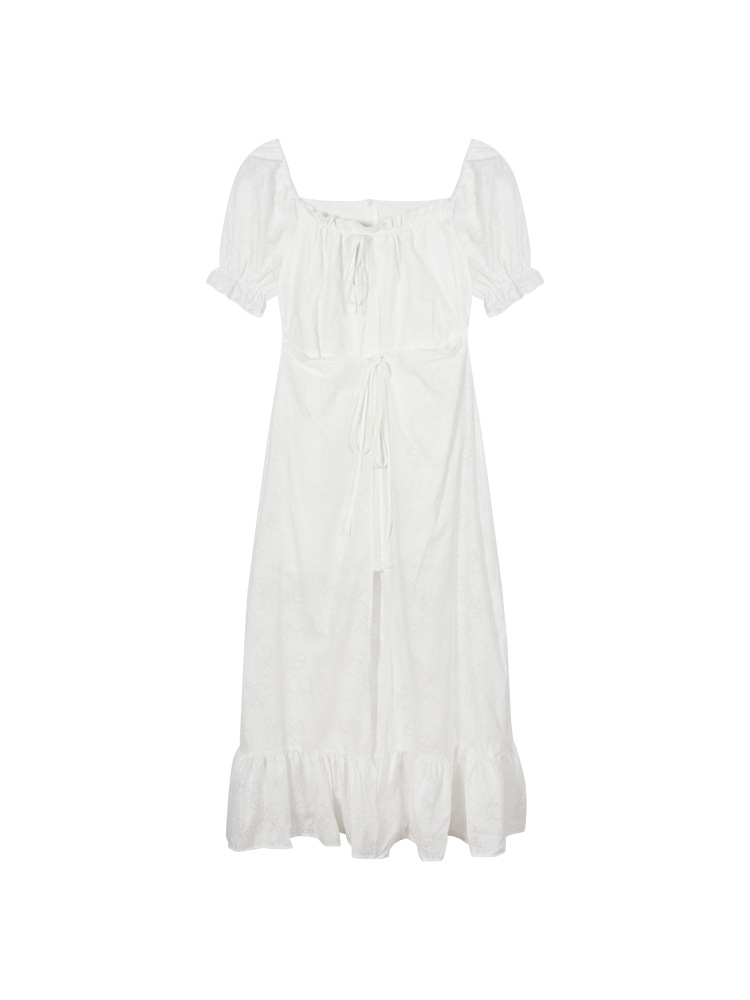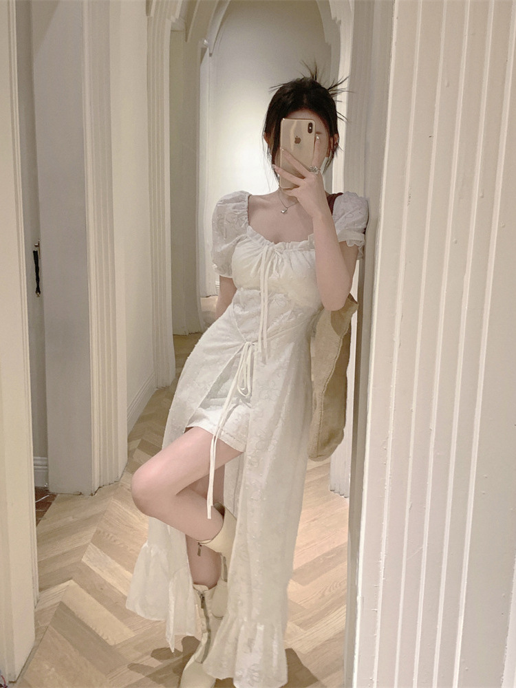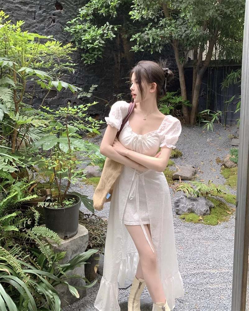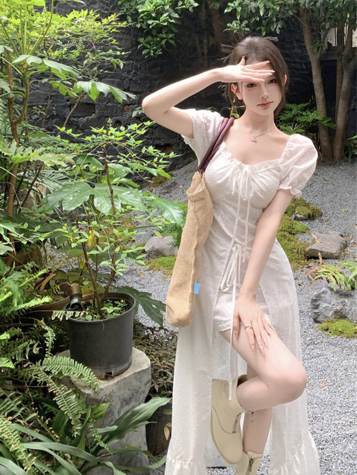 芭蕾风方领绑带白色连衣裙女夏季泡泡袖荷叶边中长裙高级感裙子