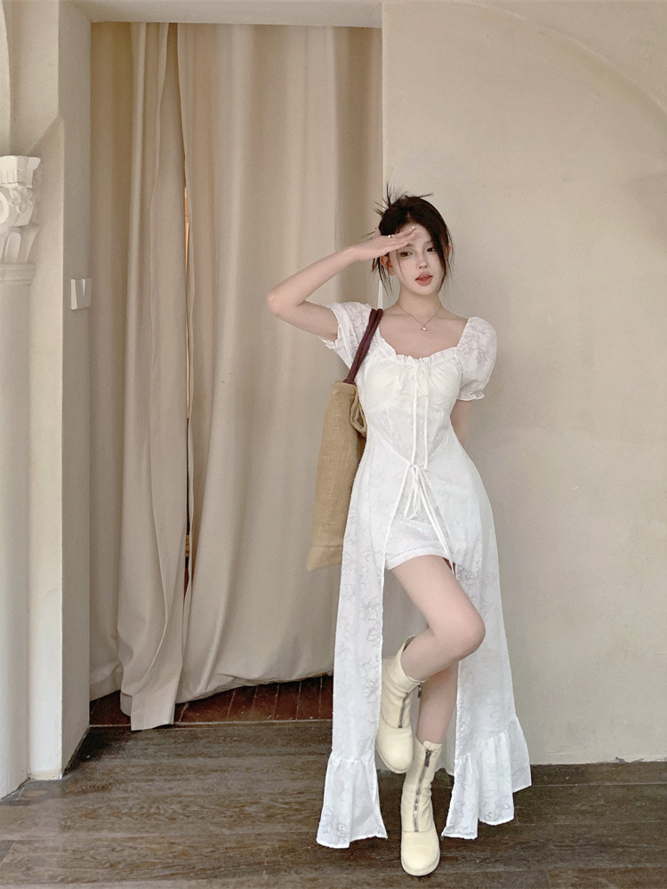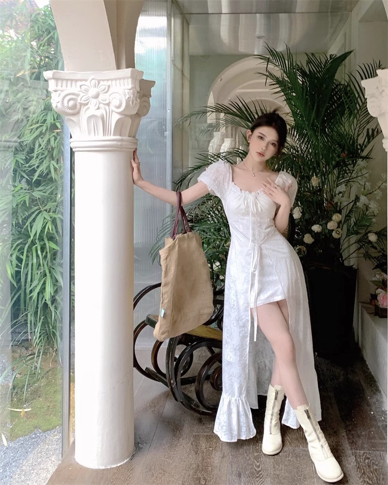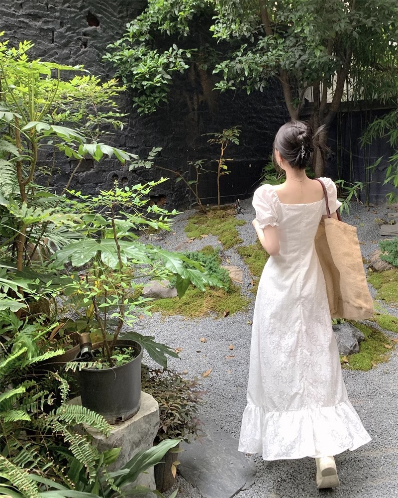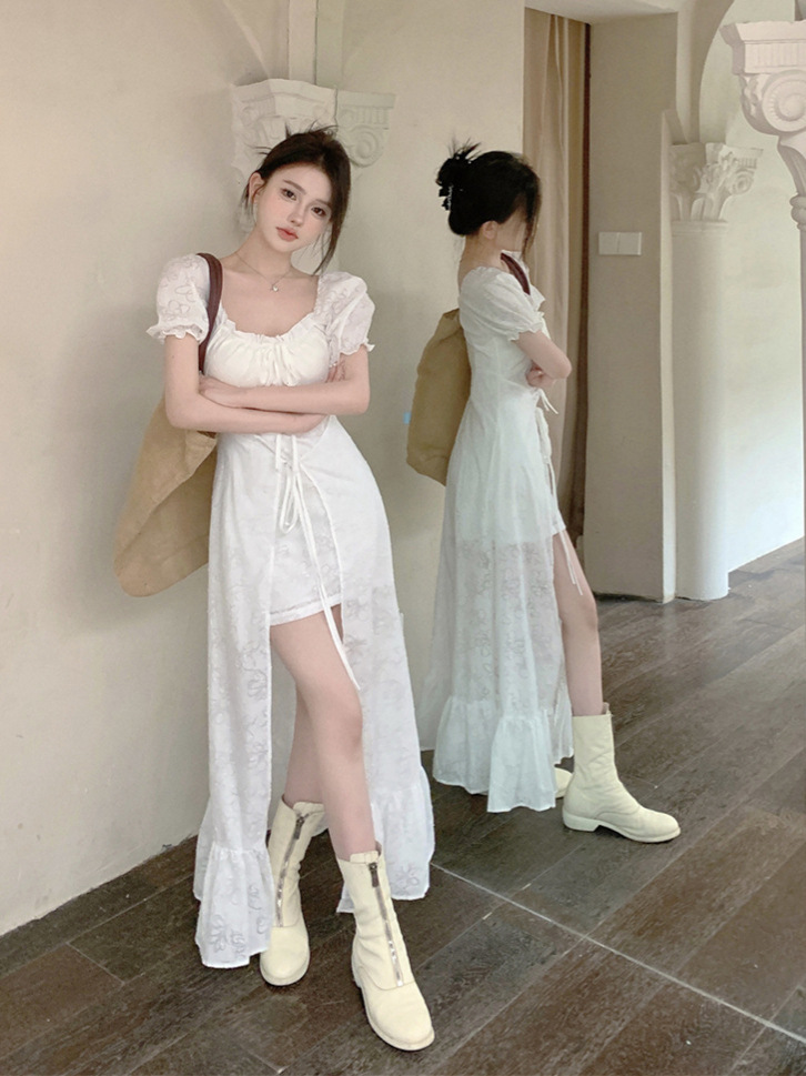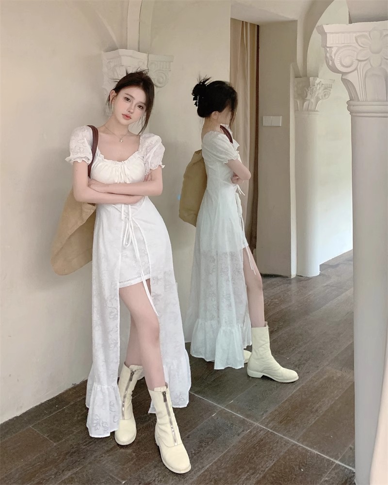 芭蕾风方领绑带白色连衣裙女夏季泡泡袖荷叶边中长裙高级感裙子