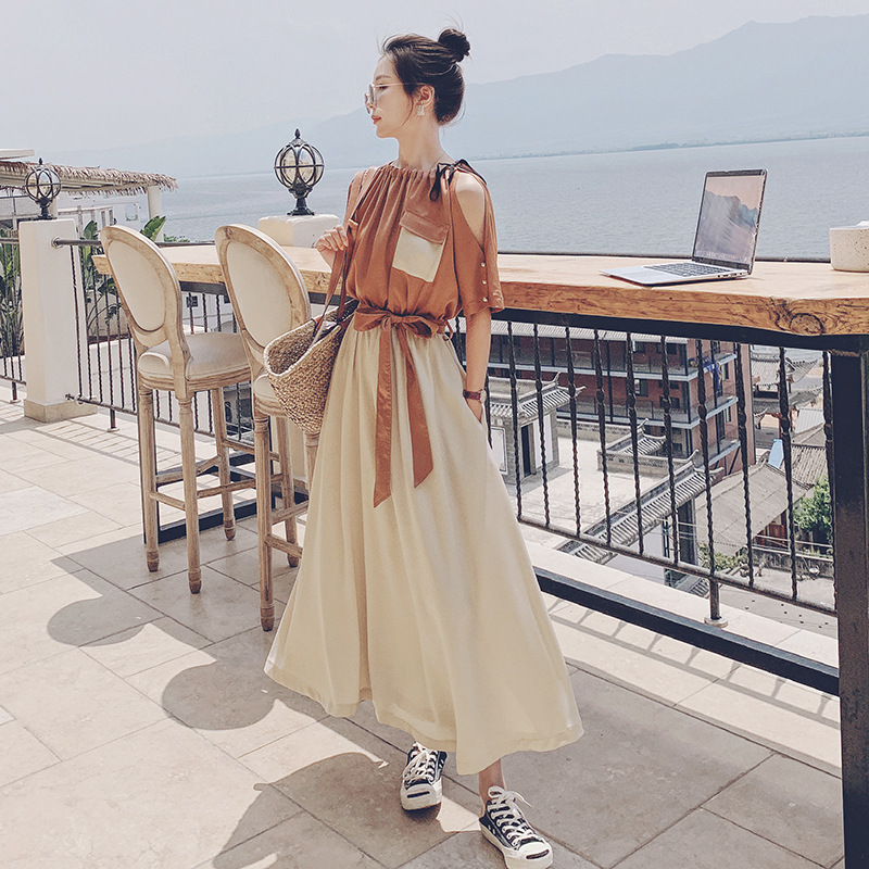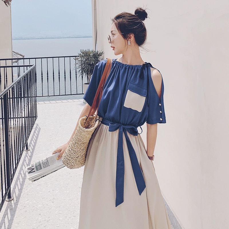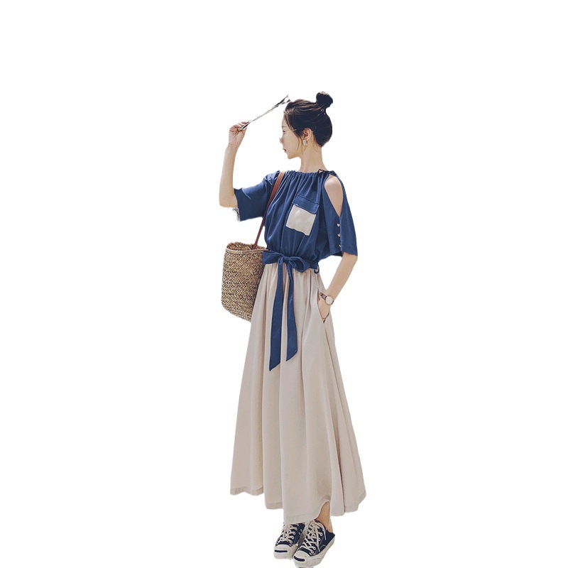 蓝色假两件连衣裙女夏季新款法式气质设计感小众到及脚踝长裙