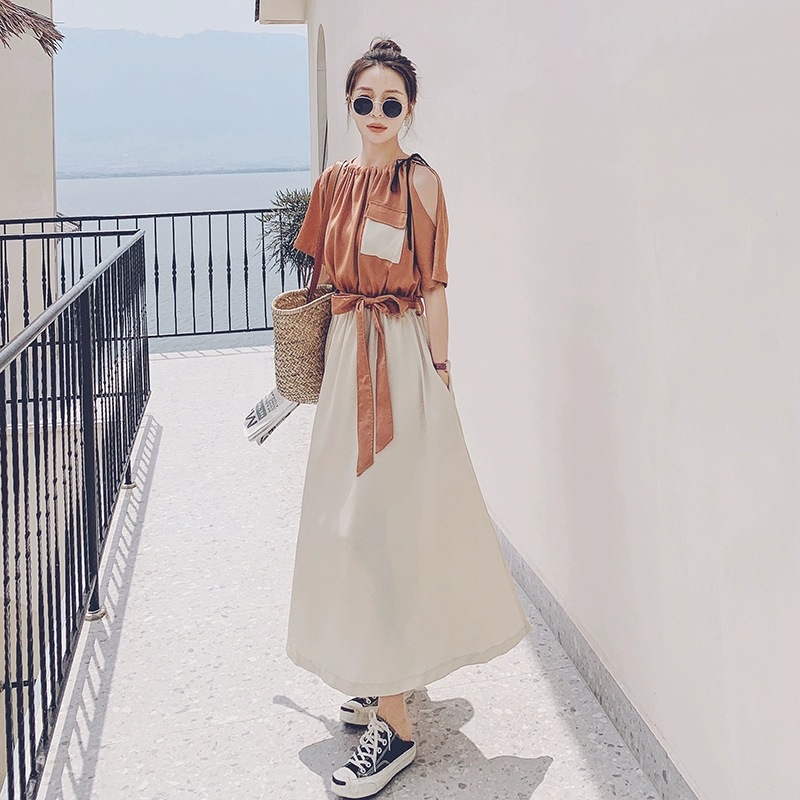 休闲夏季新款甜美气质a字撞色假两件拼接层层蕾丝蛋糕连衣裙