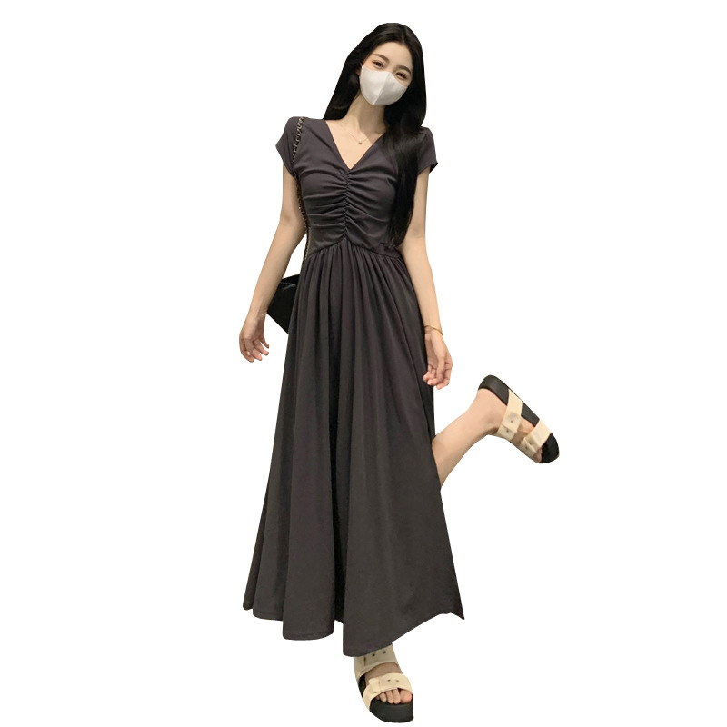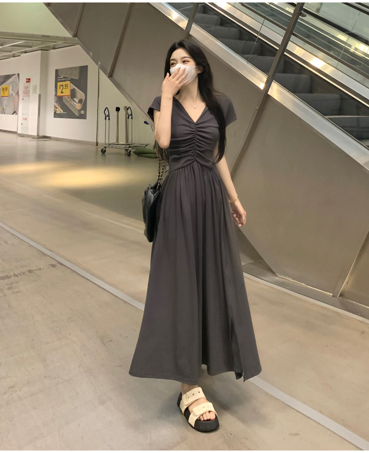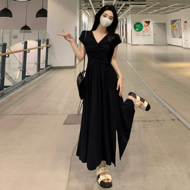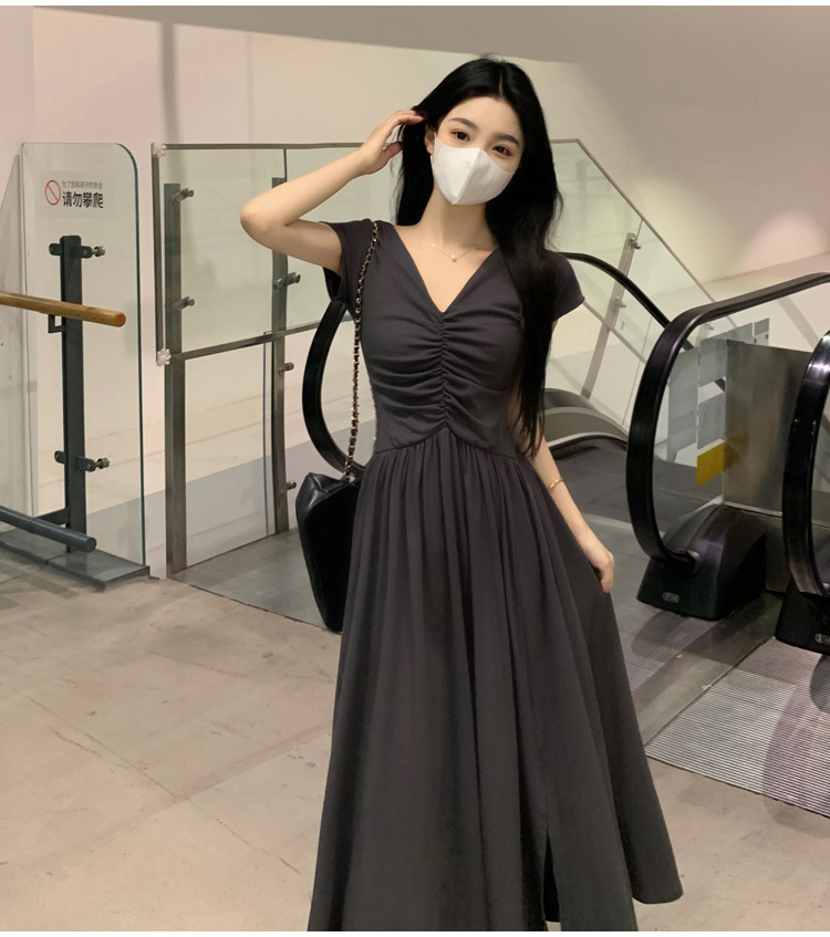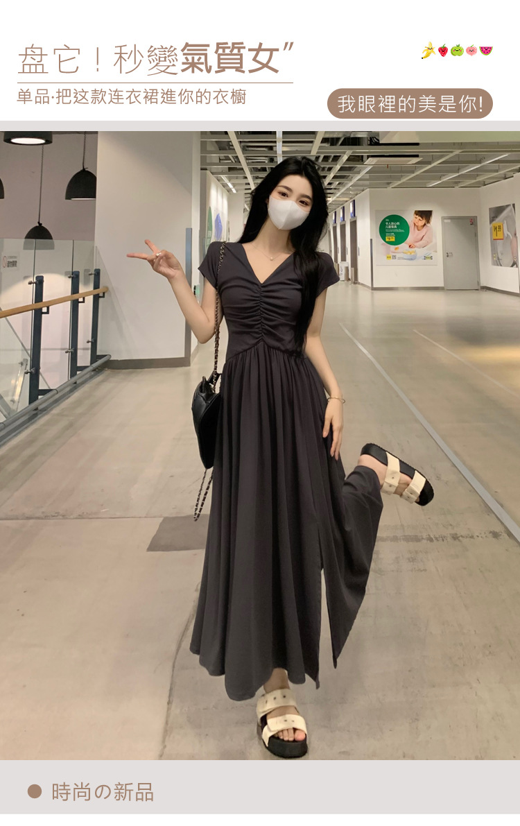 ~大码女装法式复古V领收腰连衣裙茶歇气质高级感度假开叉裙子