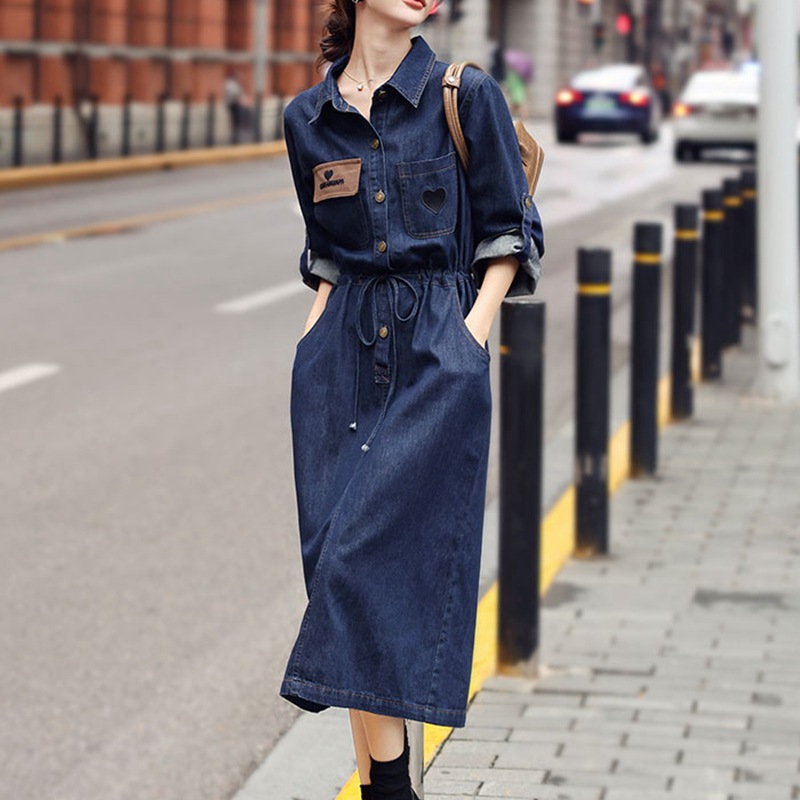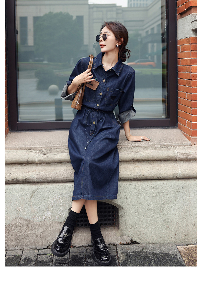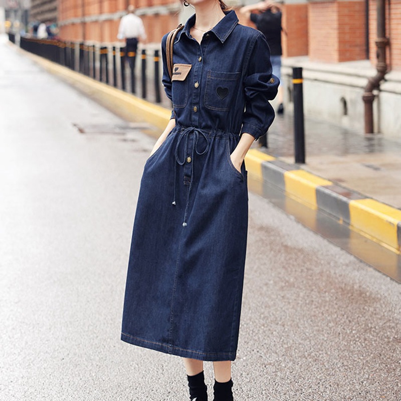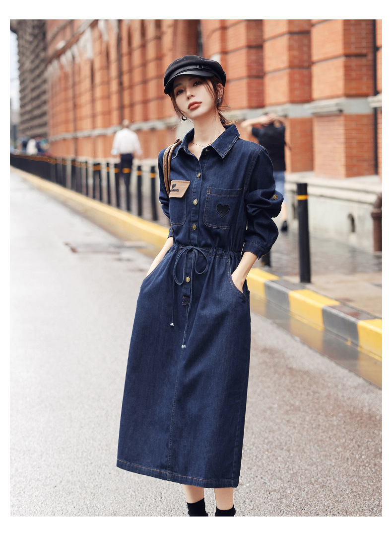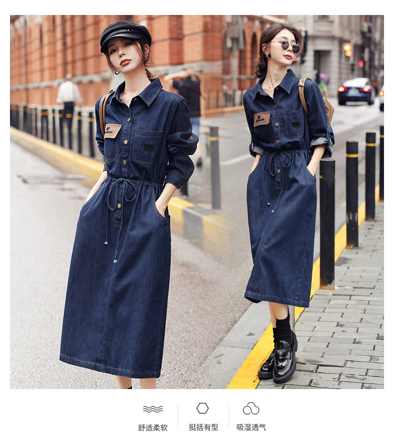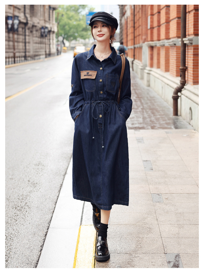 时尚春装新款宽松显瘦中长女装洋气绣花抽绳长袖牛仔连衣裙子