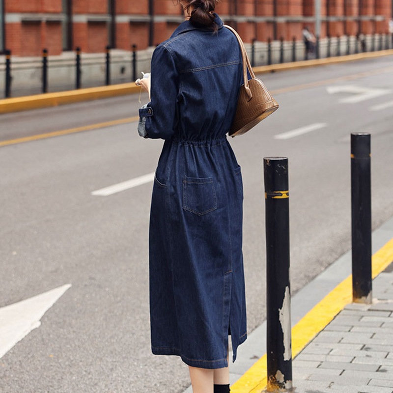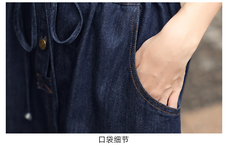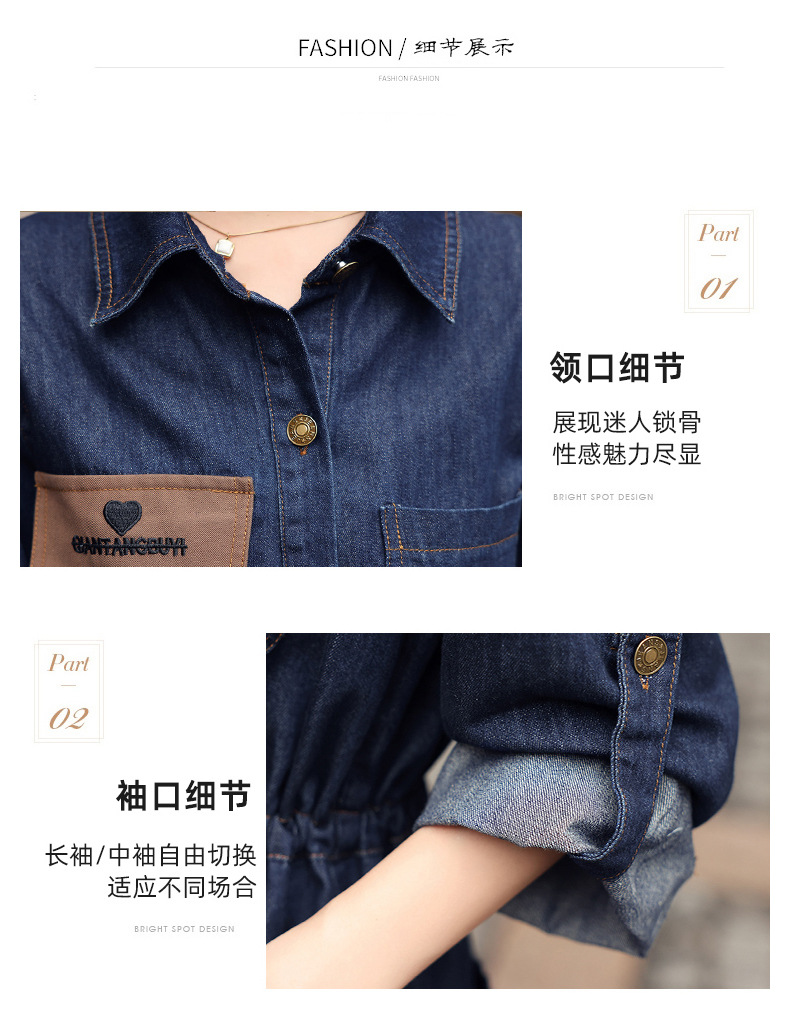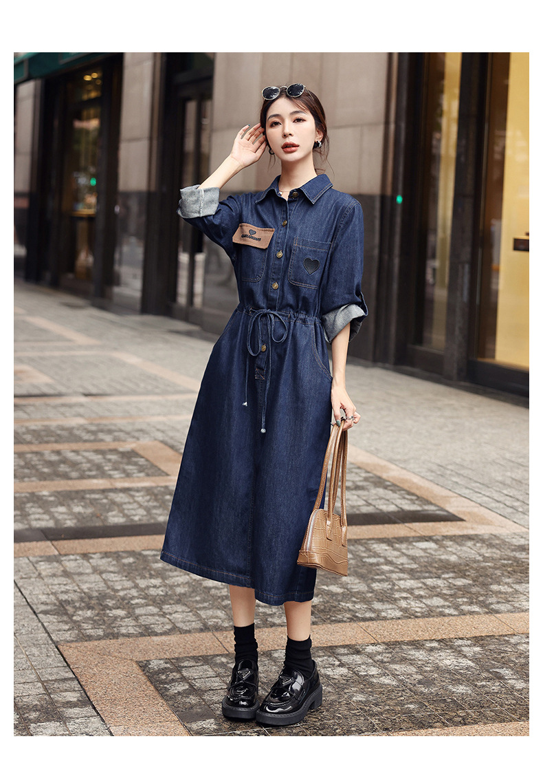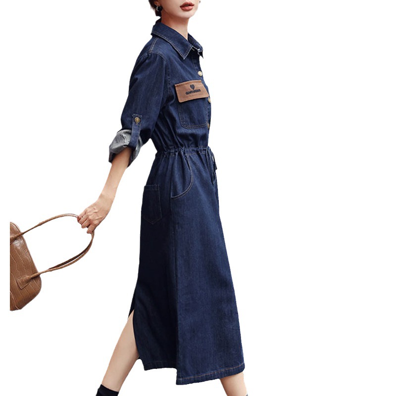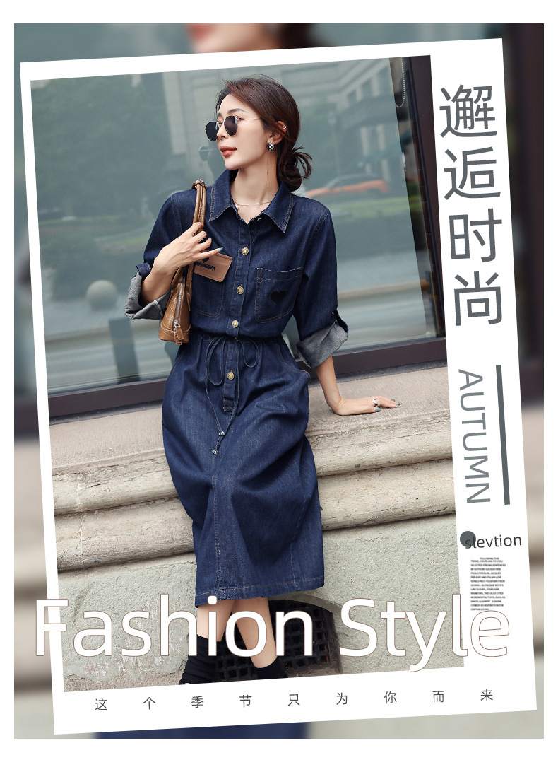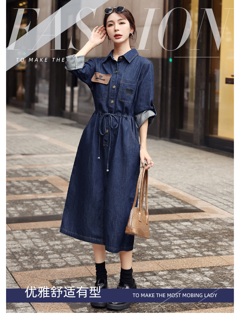 时尚春装新款宽松显瘦中长女装洋气绣花抽绳长袖牛仔连衣裙子
