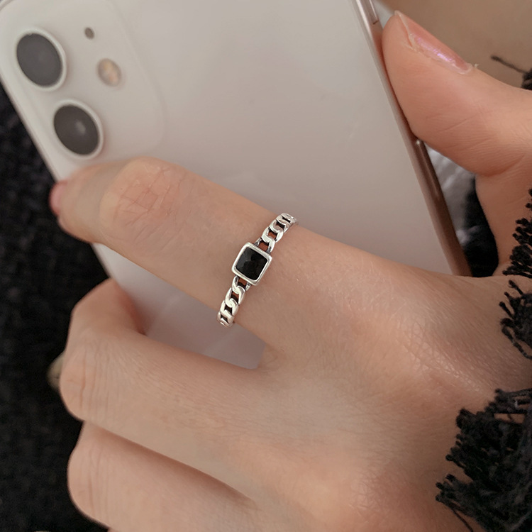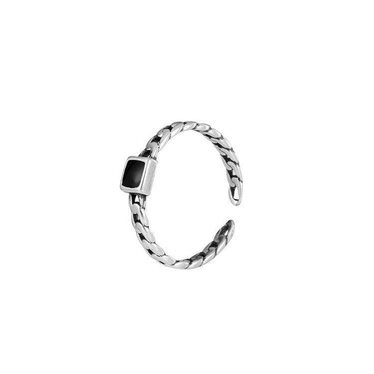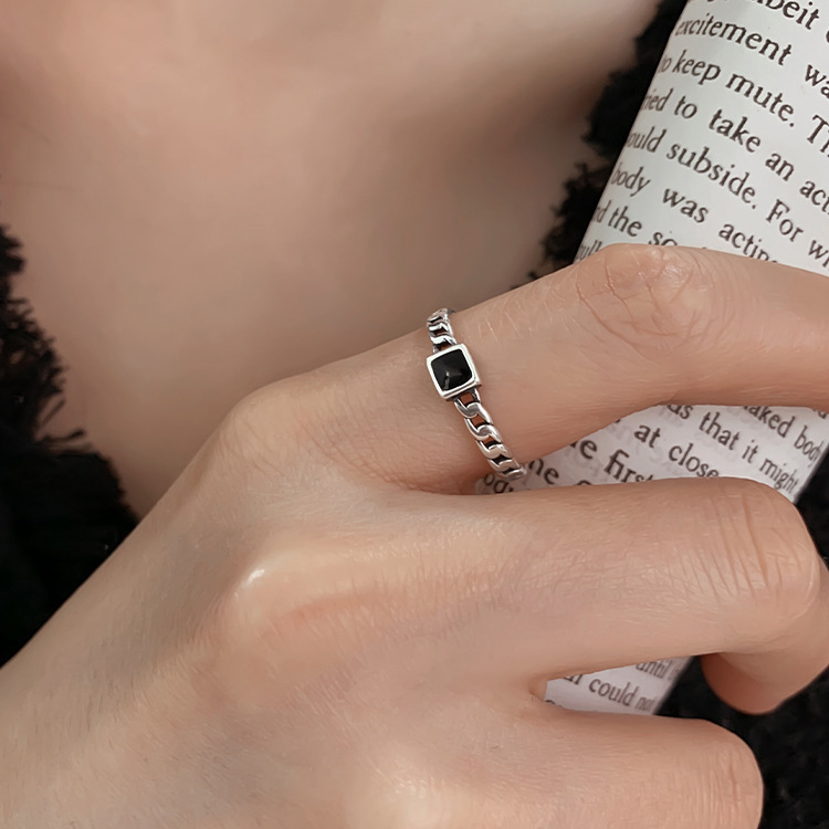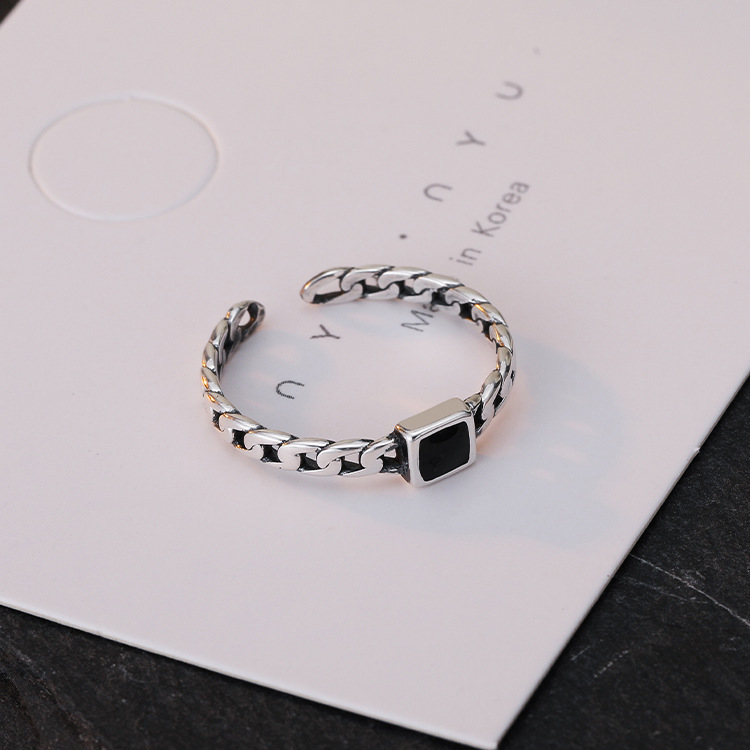新款黑色滴釉复古食指银戒指女时尚方形日常百搭个性潮百搭开口戒