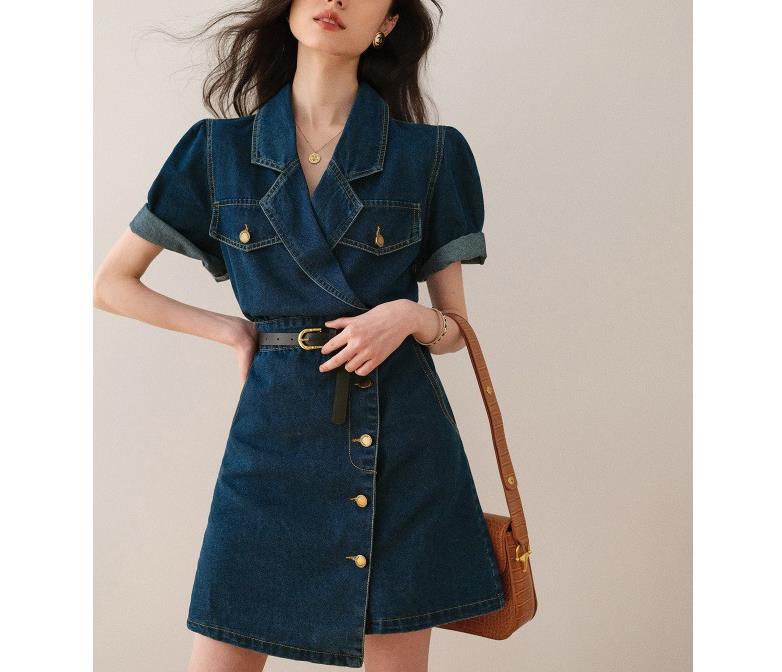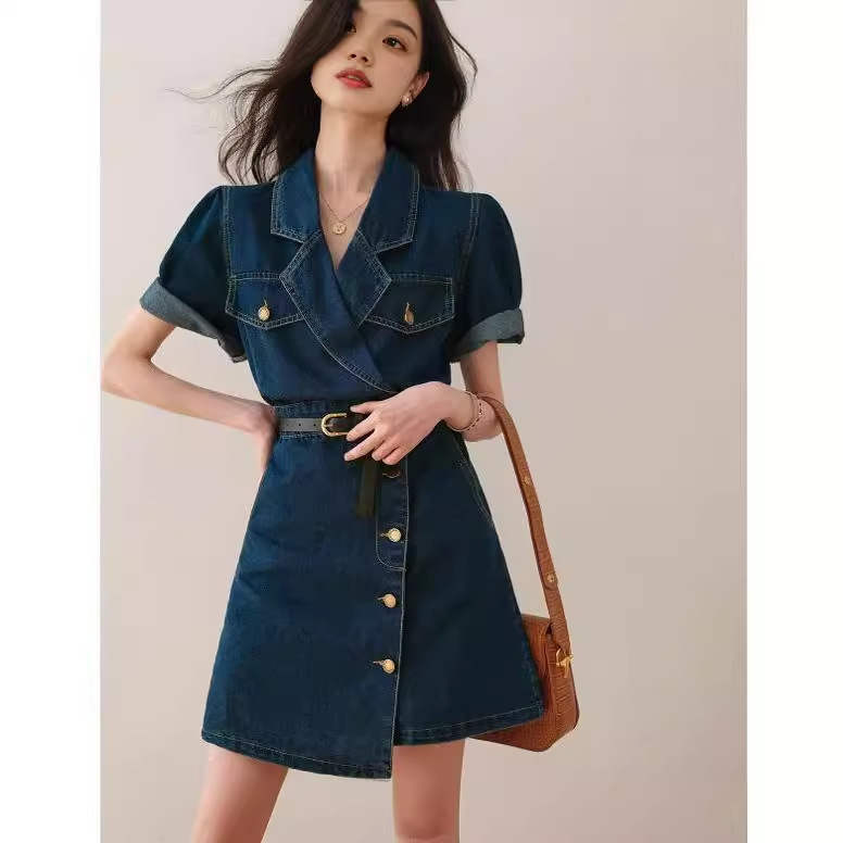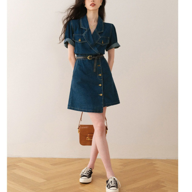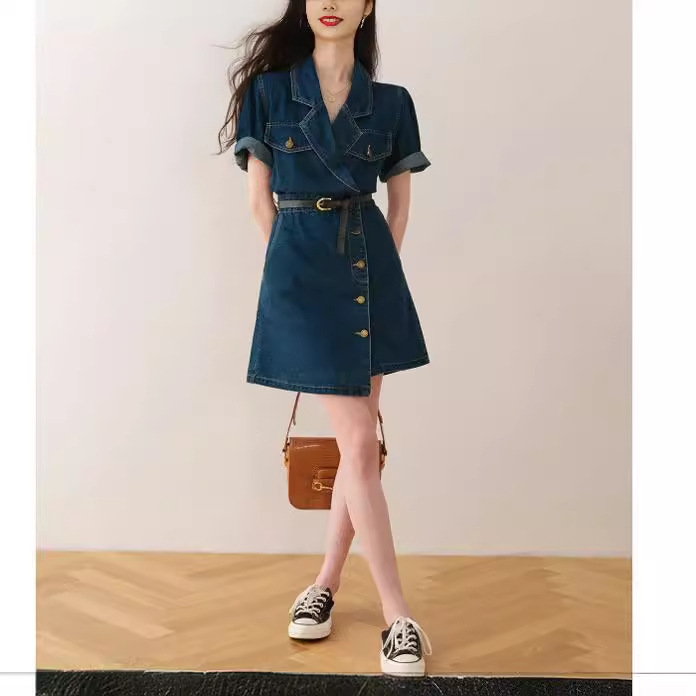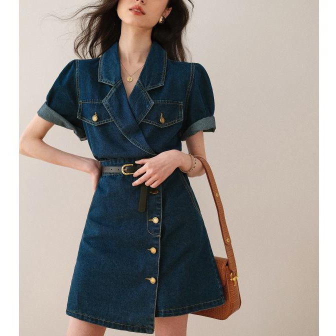 复古港风牛仔连衣裙今年流行设计感收腰显瘦通勤短袖小个子裙
