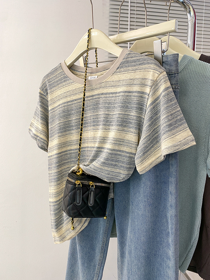 条纹正肩短袖t恤小个子女夏季设计感小众复古慵懒感宽松上衣