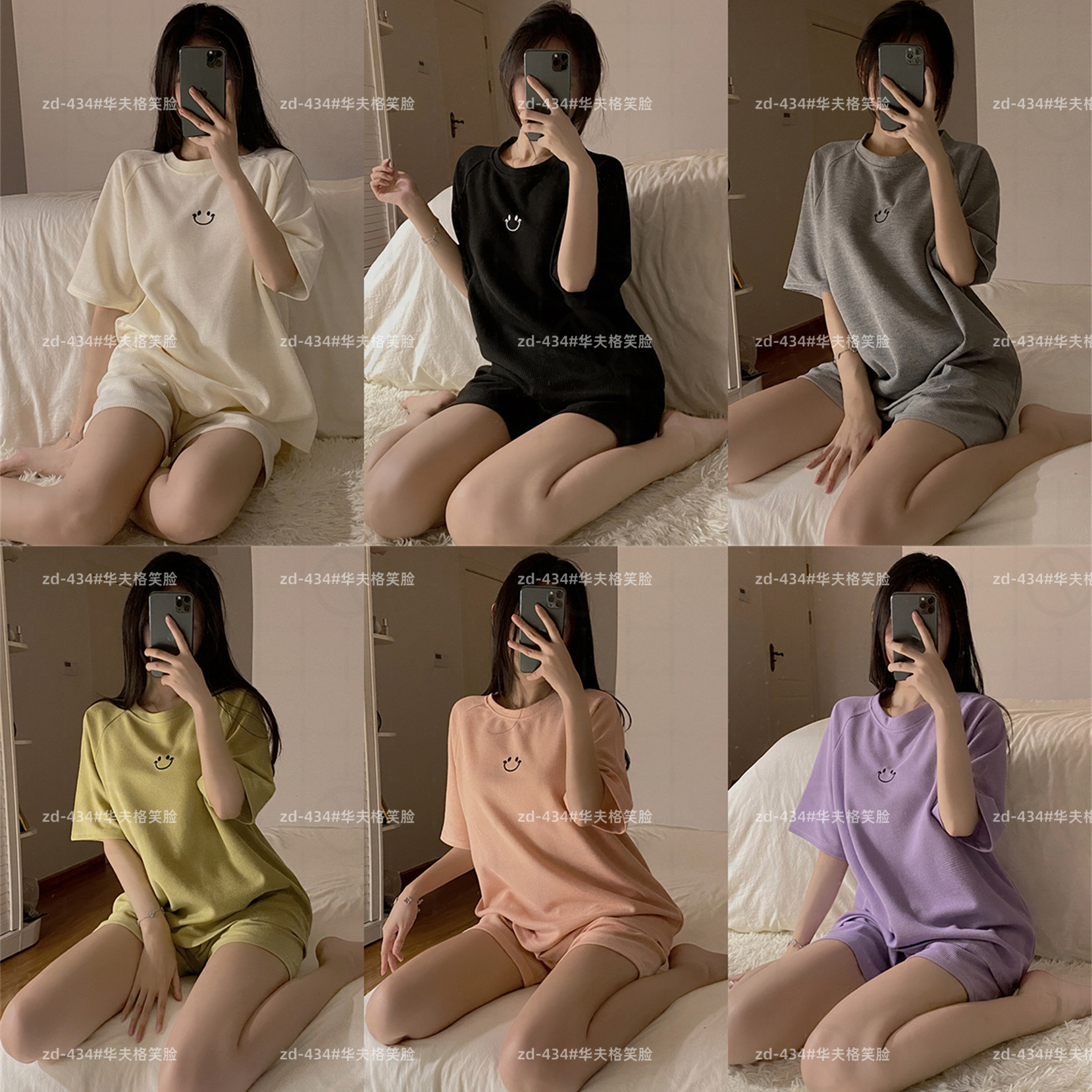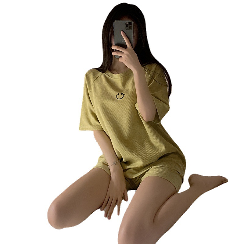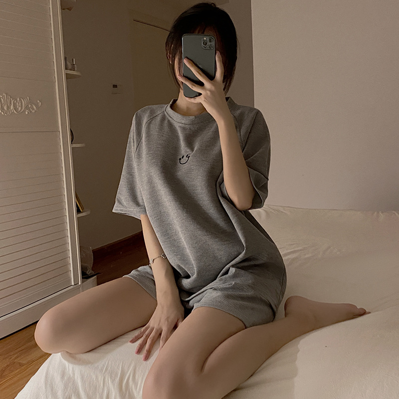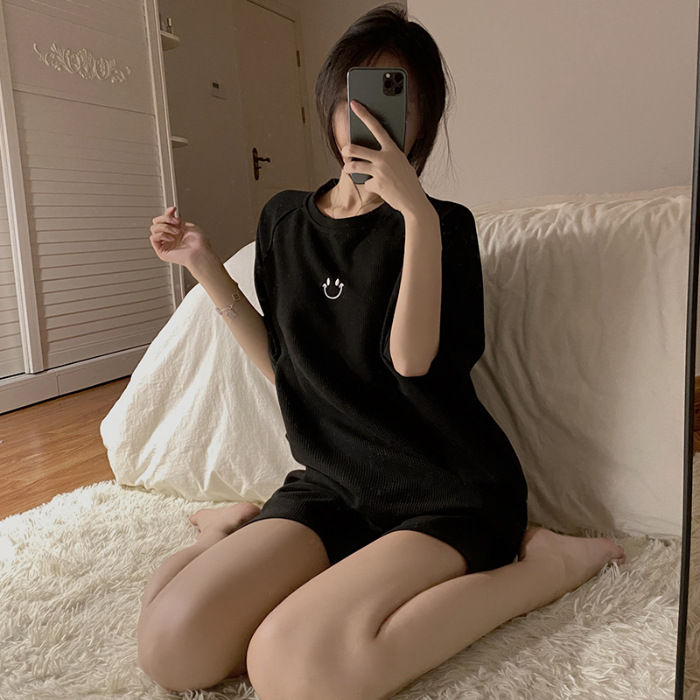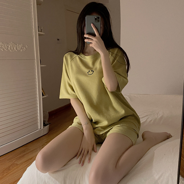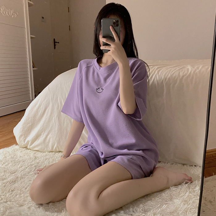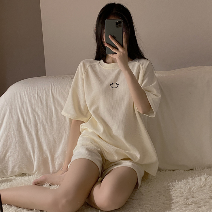实力厂家批发睡衣女华夫格夏季短袖运动笑脸可外穿时尚家居服套装