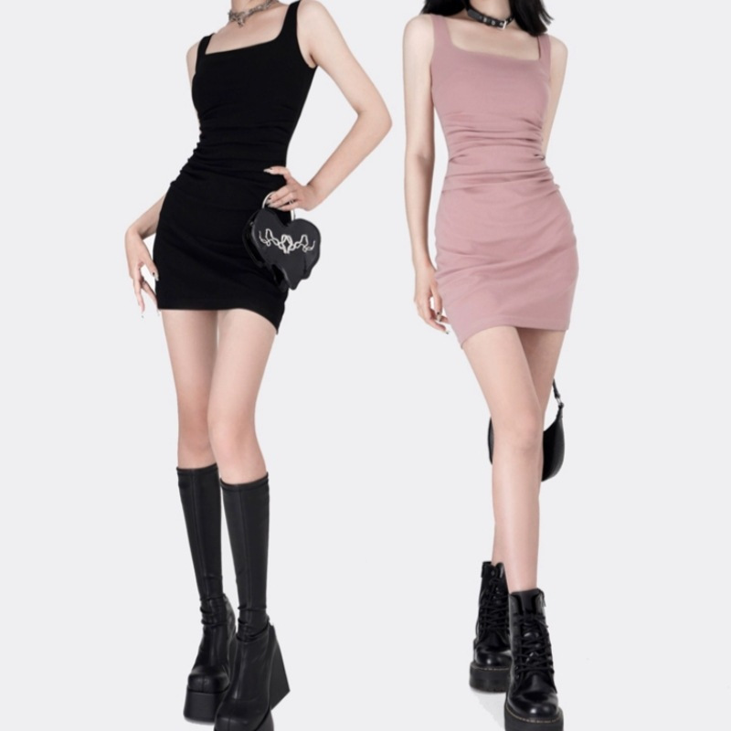 一秒显瘦 纯欲辣妹方领弹力遮副乳显瘦包臀连衣裙吊带连衣裙