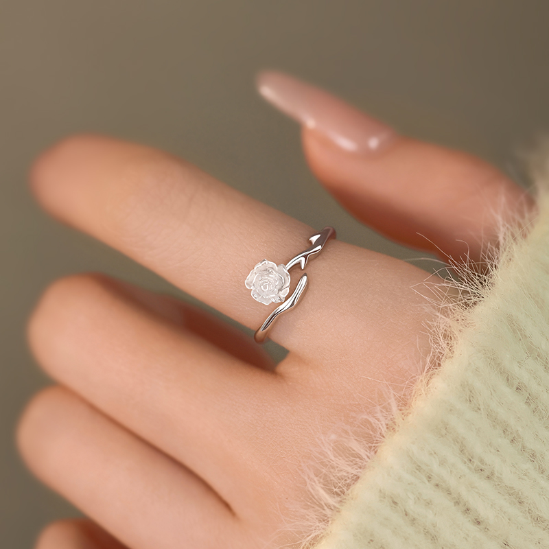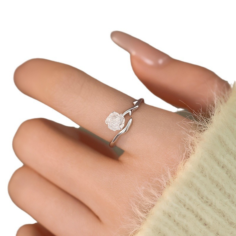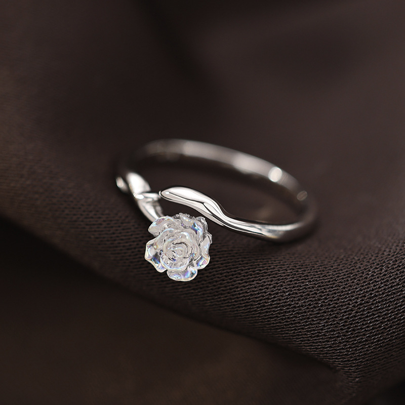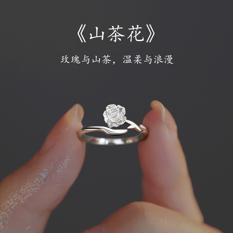 新款冰雪水晶山茶花戒指女指环戒小众设计温柔开口戒简约清新