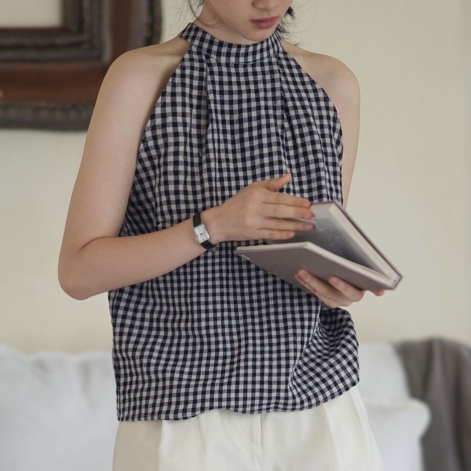 苎麻色织格纹系脖上衣背心衬衫女夏舒适简约上衣