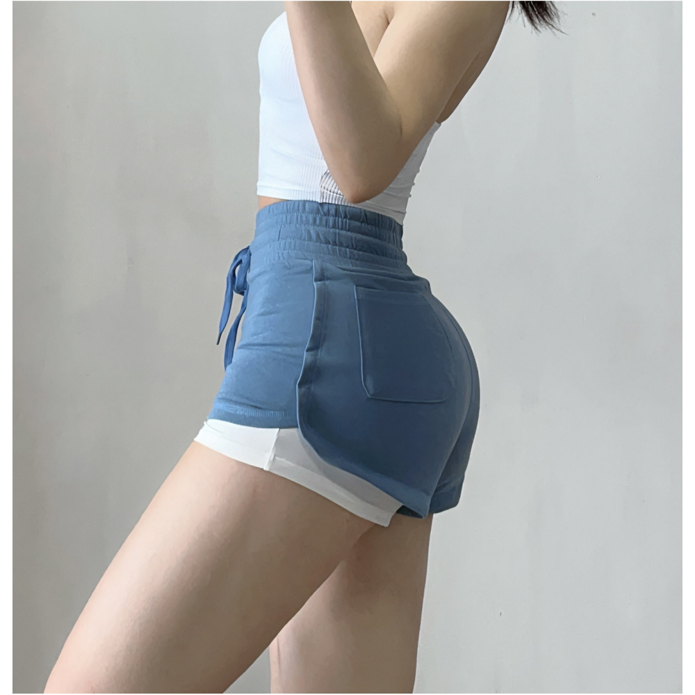 运动短裤女蜜桃提臀性感三分假两件防走光健身辣妹豆绿色热裤