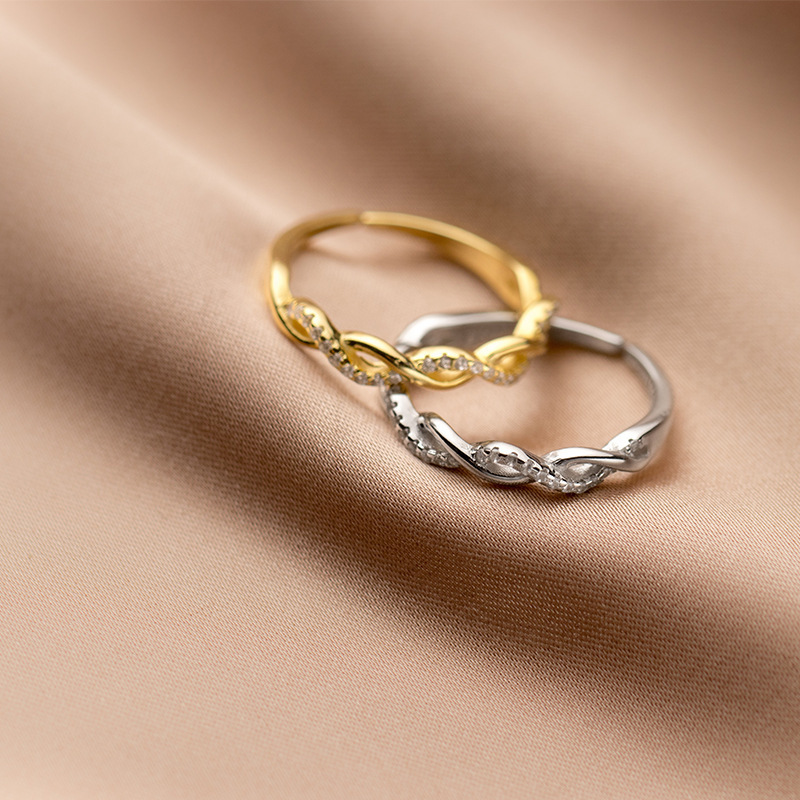 新品韩版气质清新甜美镂空交叉环形波浪黄金色镶钻戒指女小众