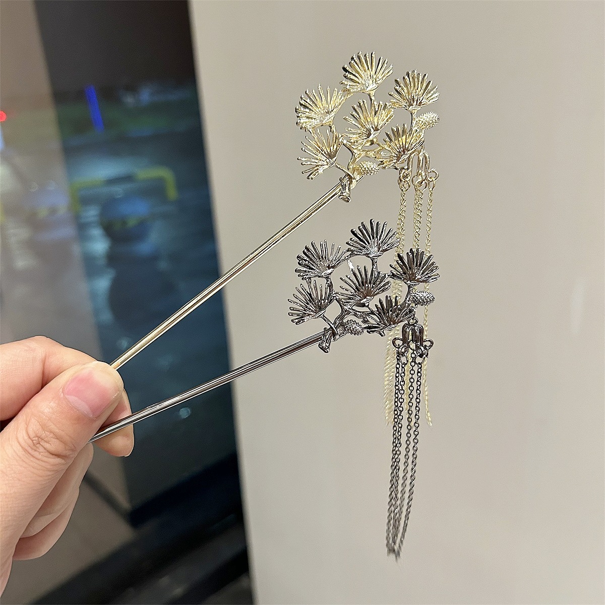 新中式迎客松枝叶子发簪金属铁树流苏发叉古装马面裙配饰发饰发钗