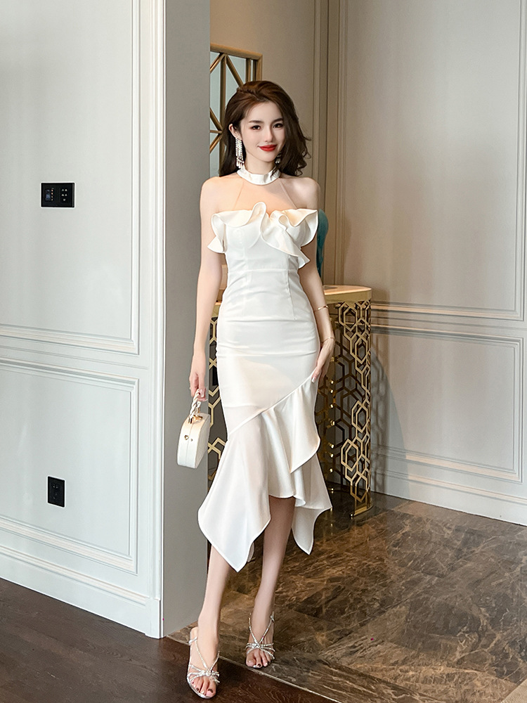 夏季新款性感挂脖露肩抹胸荷叶边修身不规则鱼尾连衣裙