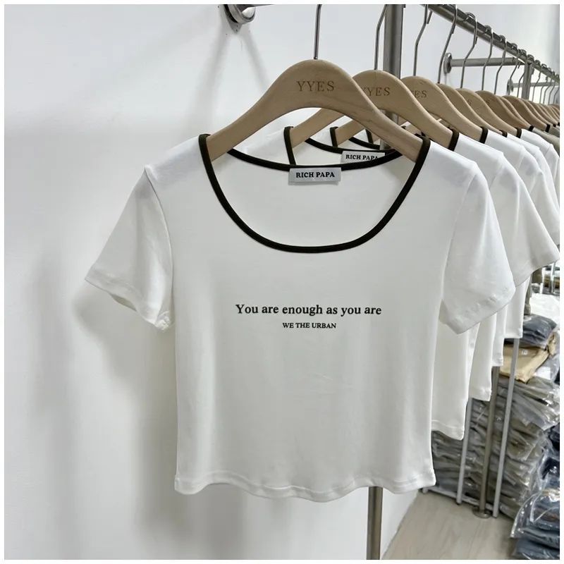 高档美式方领气质印花短袖t恤女夏季韩版新款短款打底衫上衣衫潮