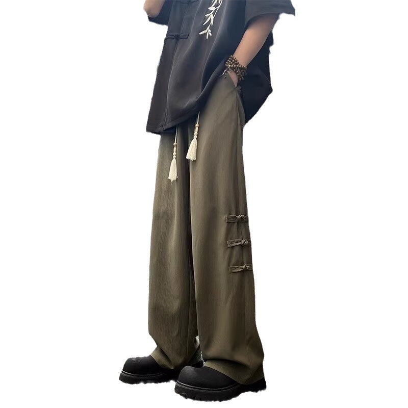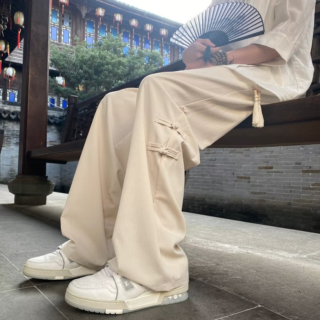 新中式国风盘扣裤子男士夏季新款高级感垂感宽松直筒阔腿休闲长裤