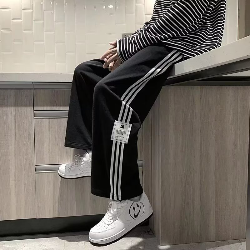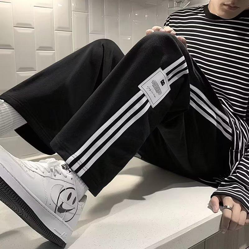 潮牌直筒裤子男生春秋季黑色百搭条纹运动卫裤宽松阔腿休闲