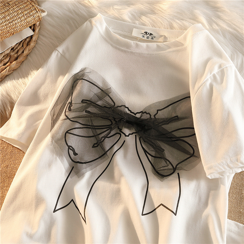 纯棉短袖t恤女夏季新款宽松韩版设计感网纱蝴蝶结半袖上衣