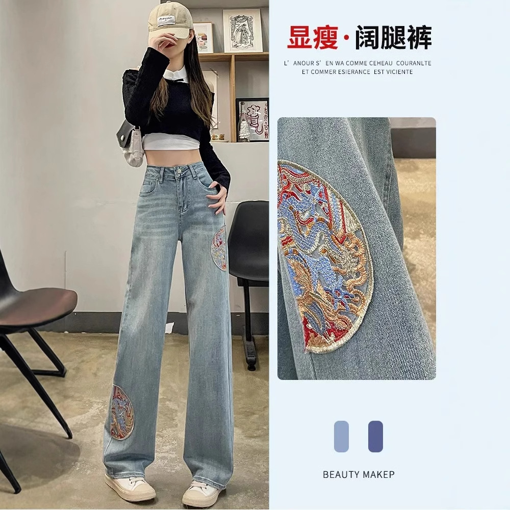 刺绣牛仔裤女高腰学生韩版宽松显瘦阔腿裤春复古拖地老爹长裤子