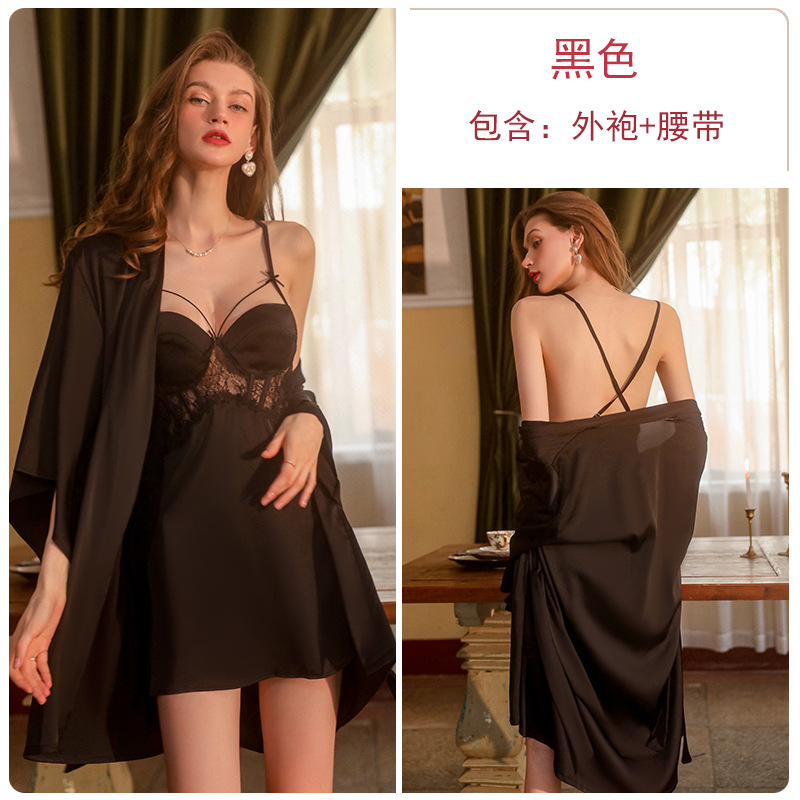 瑰若春夏新款露背冰丝睡衣系带外袍简约纯欲风女式家居服套装