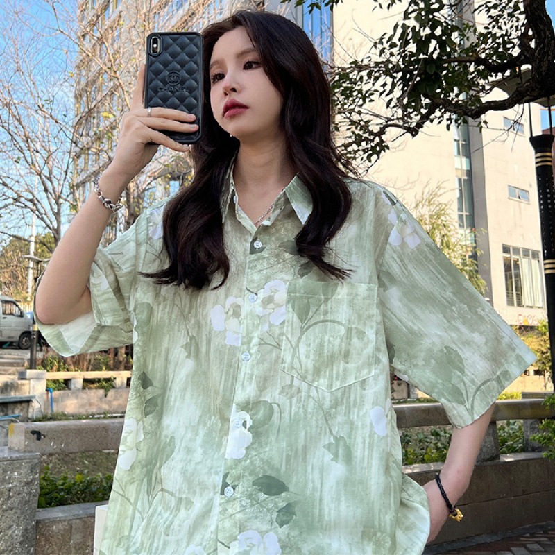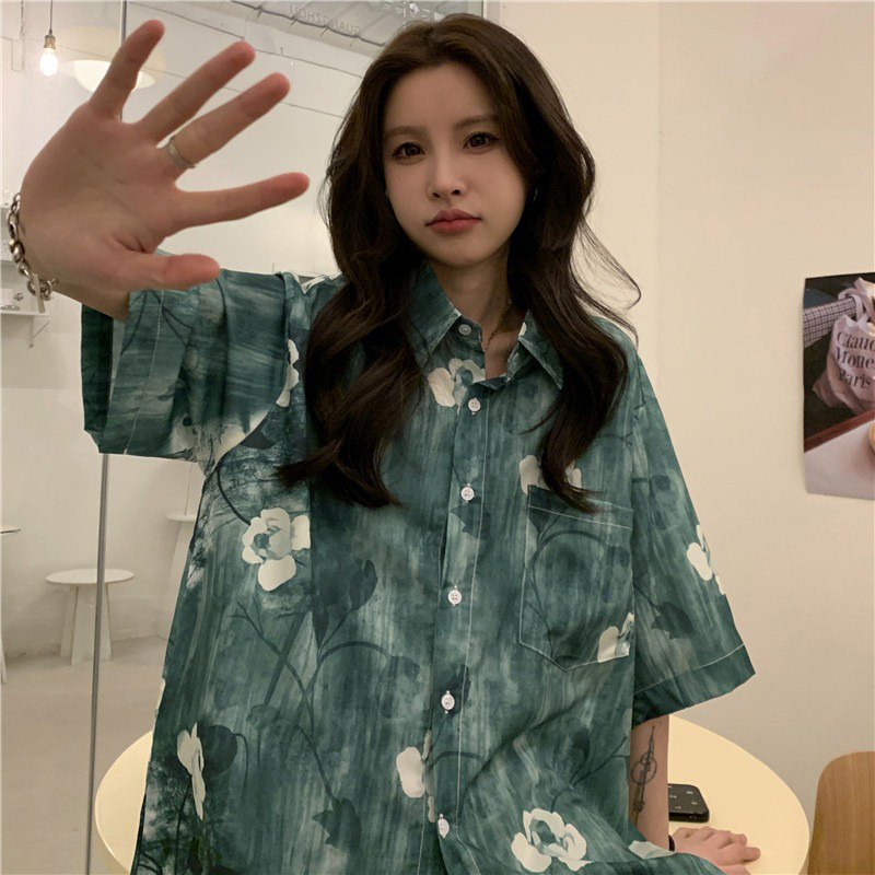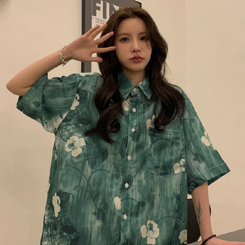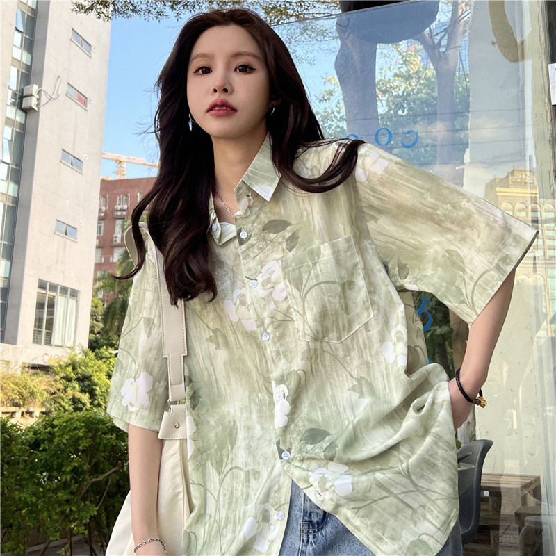 美式复古衬衫女扎染花朵小众设计感潮外穿慵懒风bf高级衬衣夏威夷
