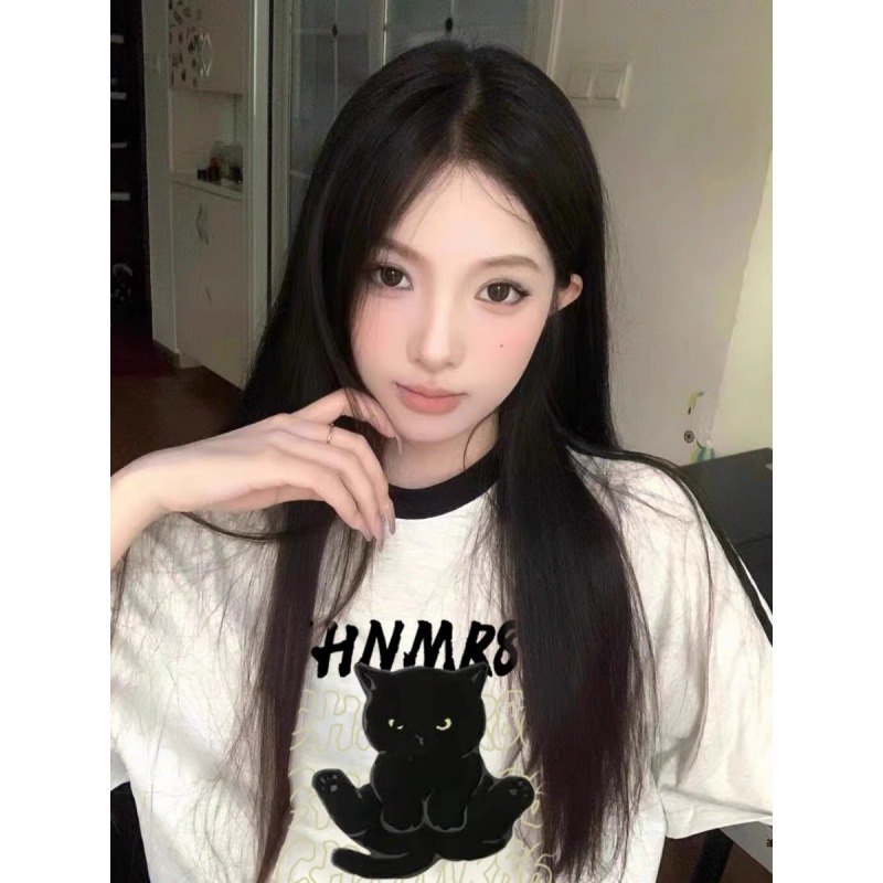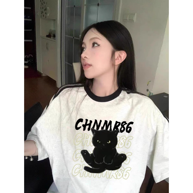 复古短袖T恤女夏季新款卡通黑猫设计感小众独特
