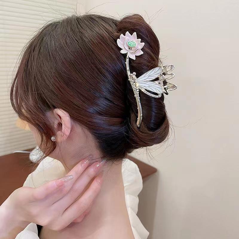 古风汉服优雅荷花蜻蜓金属抓夹珍珠发夹高级感时尚后脑勺鲨鱼夹子