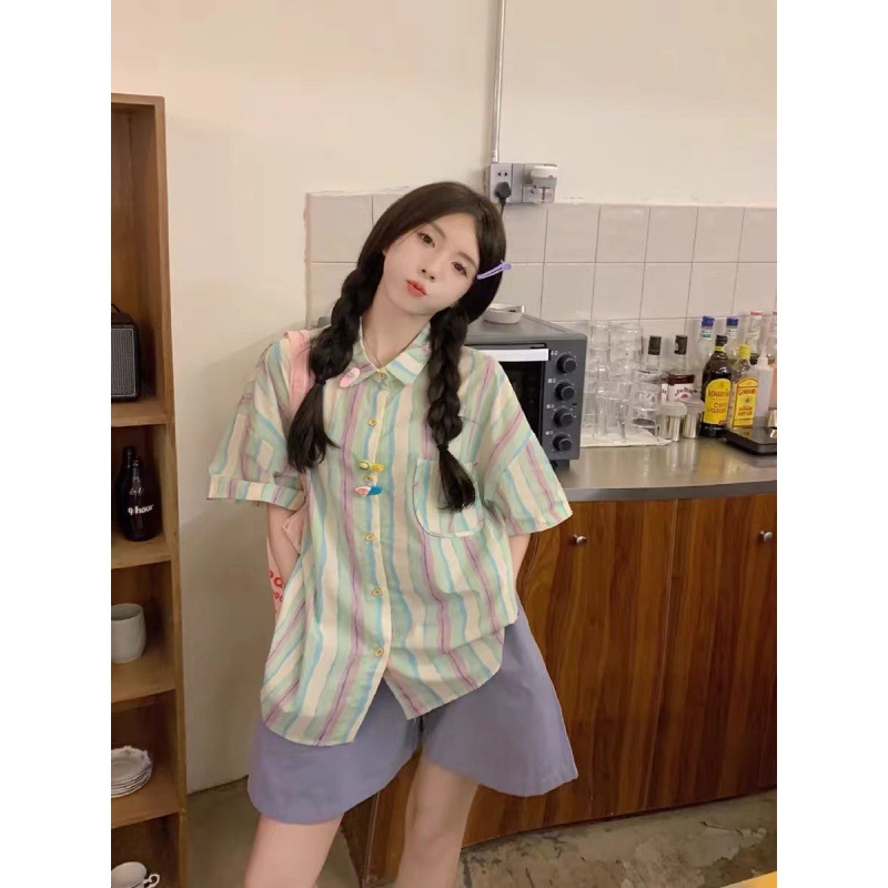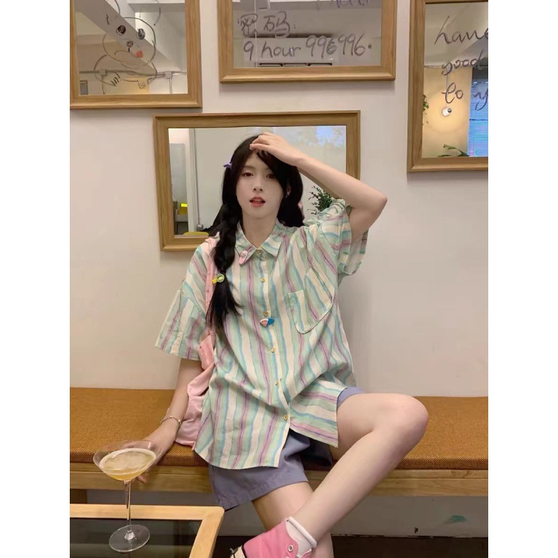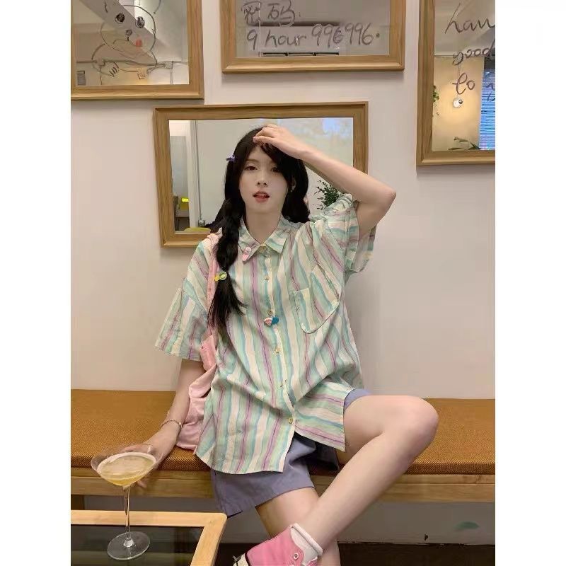 多巴胺可爱条纹短袖衬衫女春季新款甜美减龄宽松中长款上衣潮