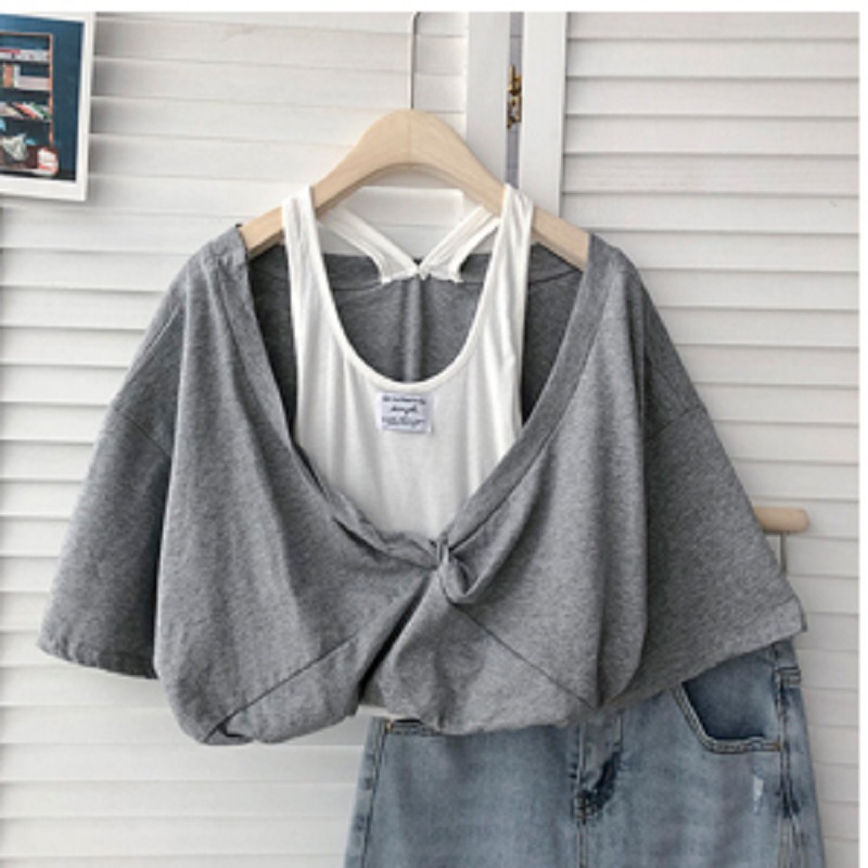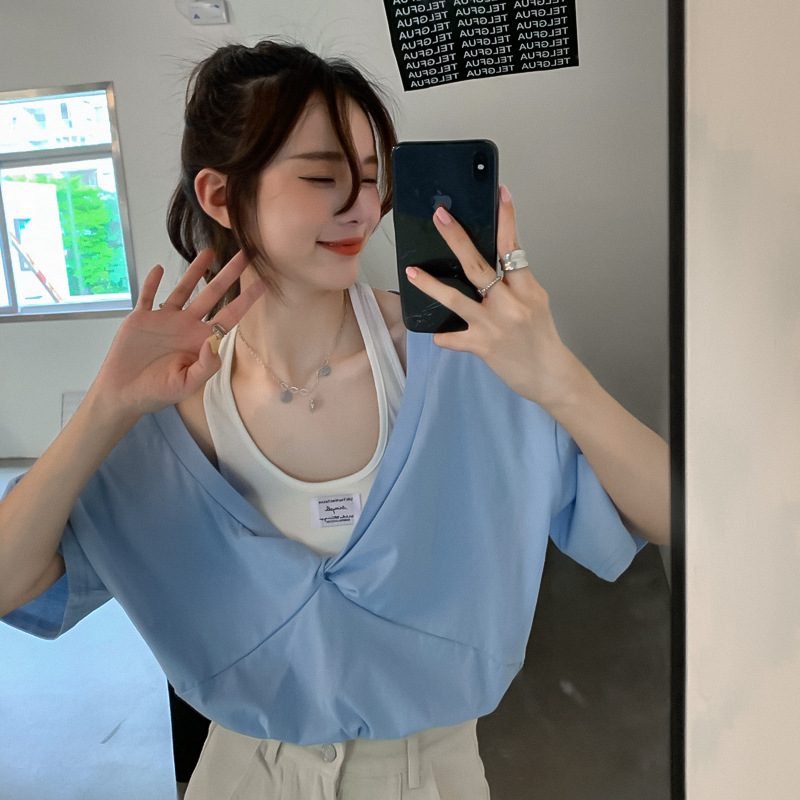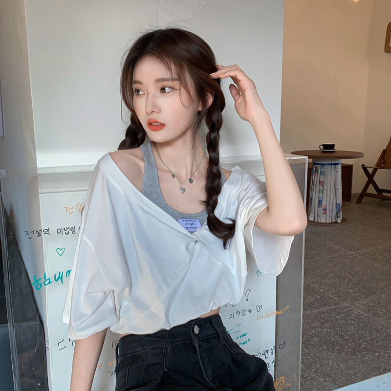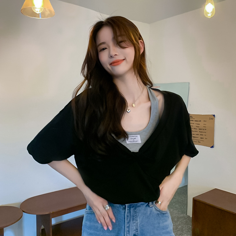 拼色假两件露肩泡泡袖短款上衣女夏装小众设计感套头洋气T恤女