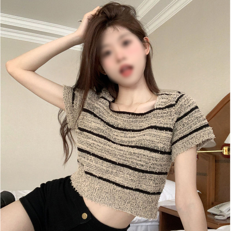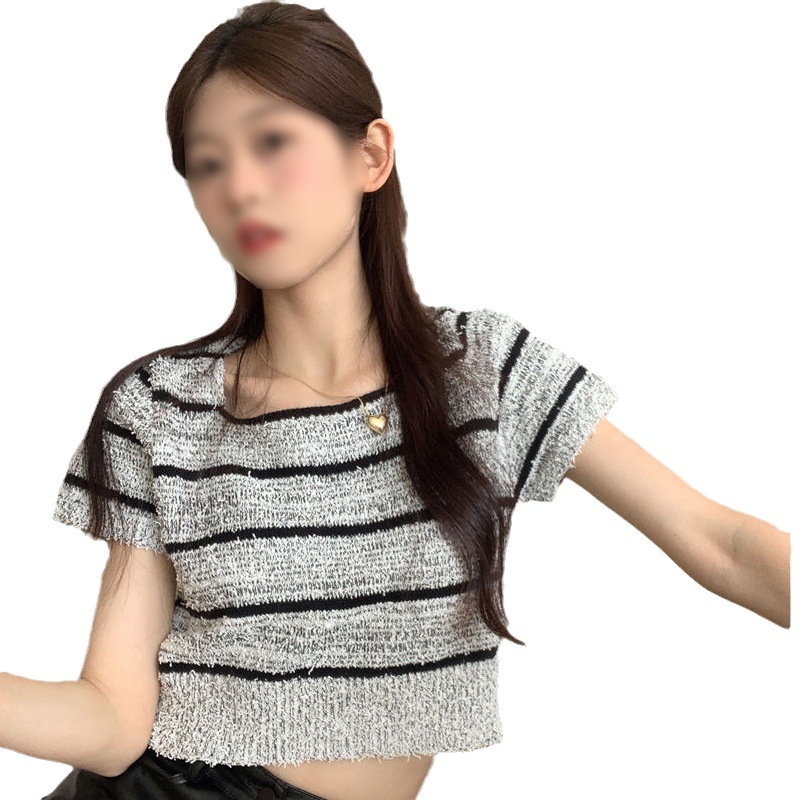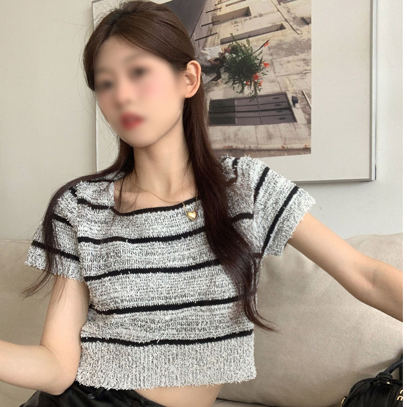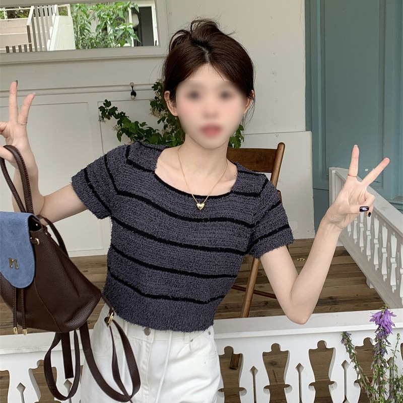 夏季新款复古修身小个子撞色条毛绒绒方领针织设计感短款上衣女潮