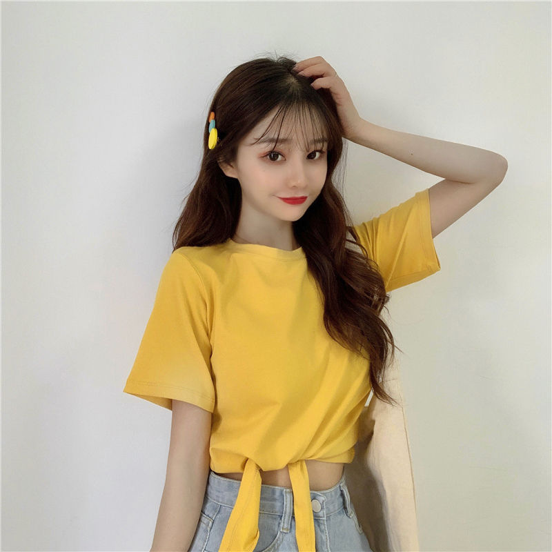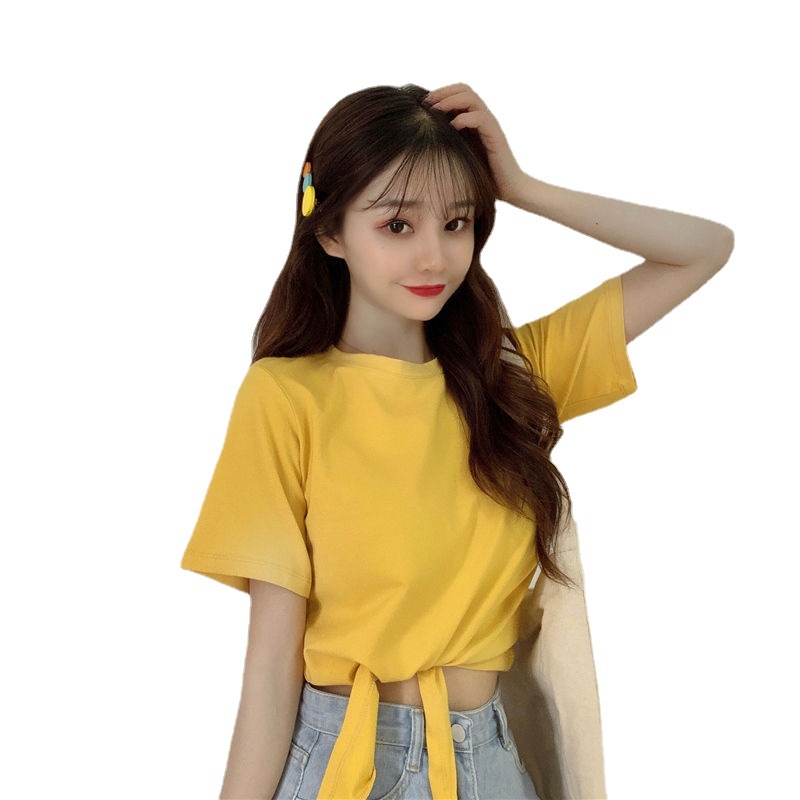 设计感打底衫女夏季新款韩版时尚高腰短款短袖纯色小心机T恤女装