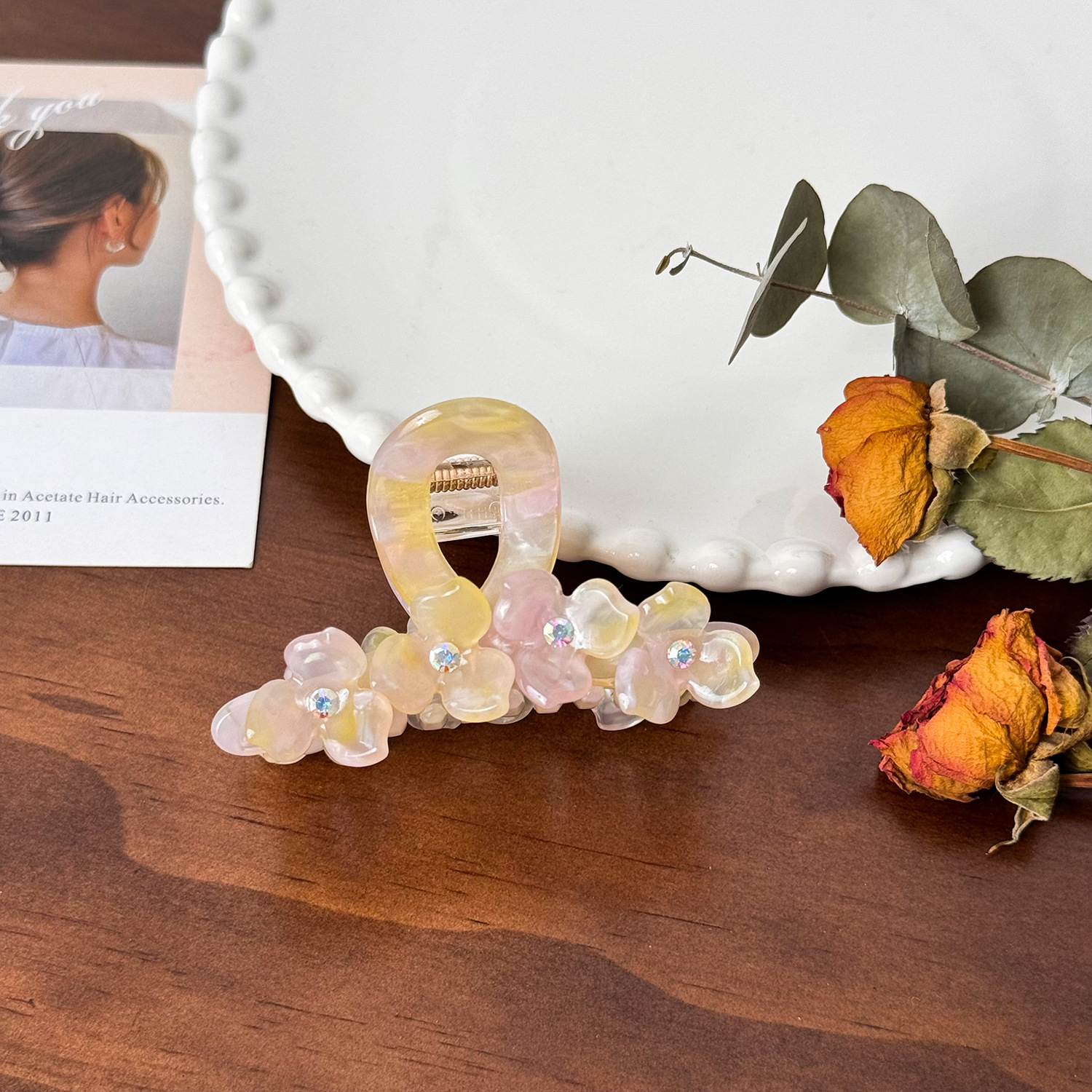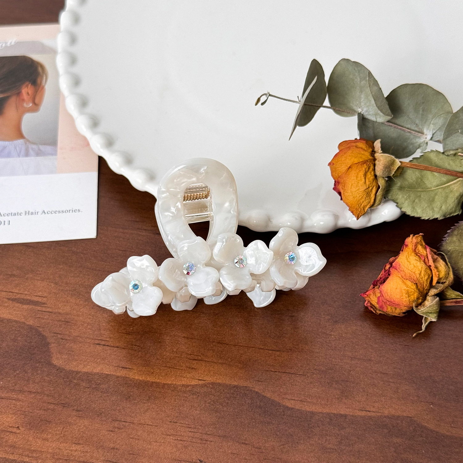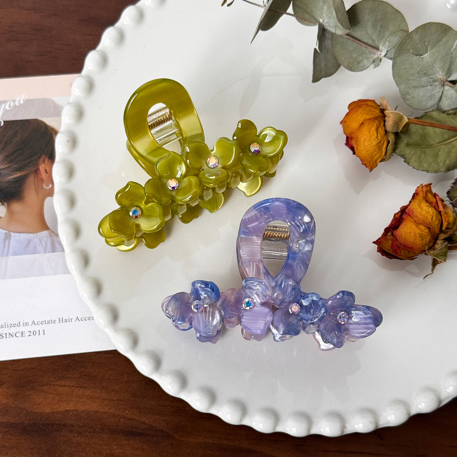 醋酸板材花朵抓夹高级感镶钻发夹中号盘发鲨鱼夹百搭发饰