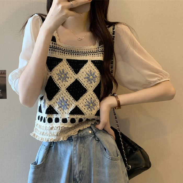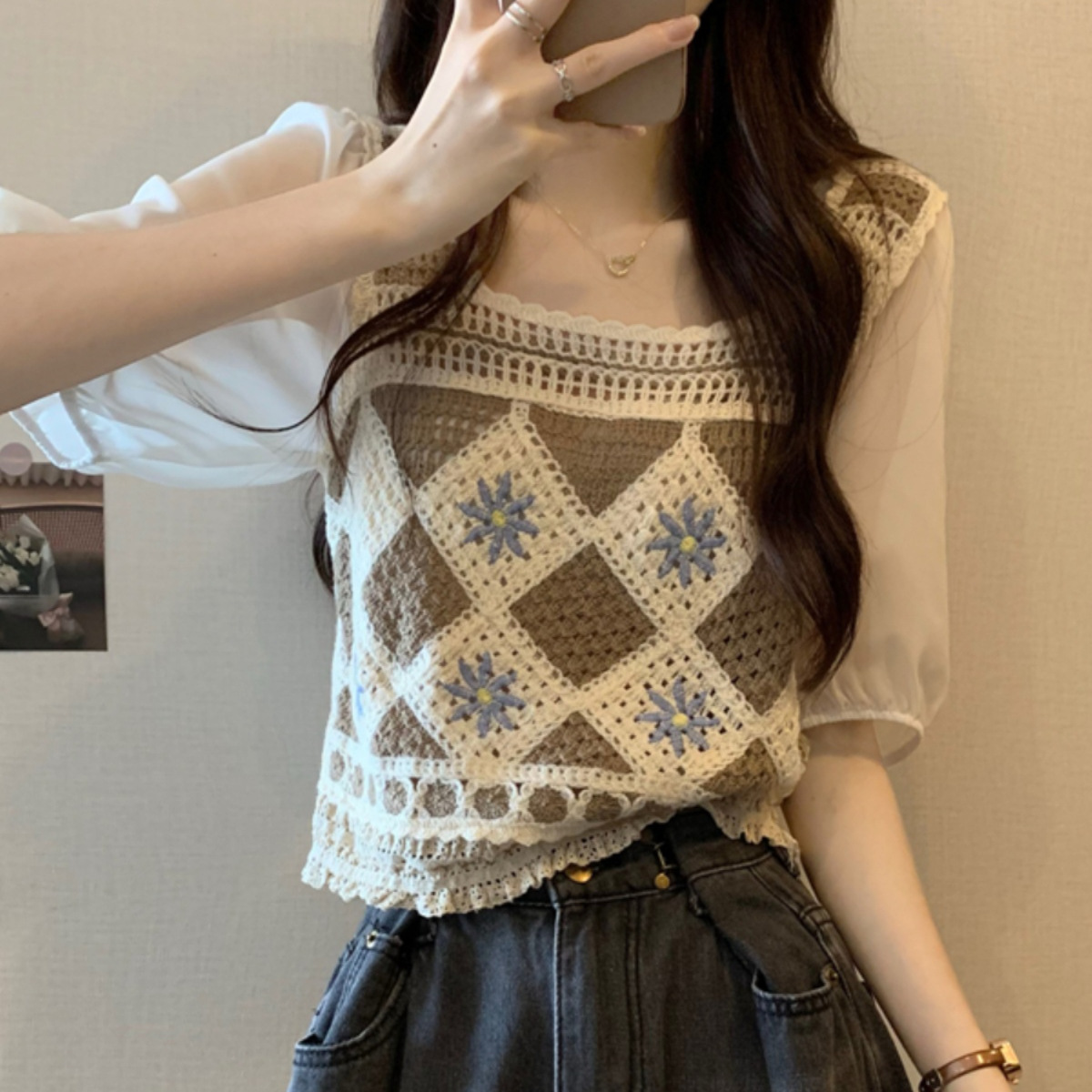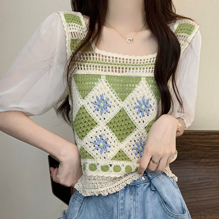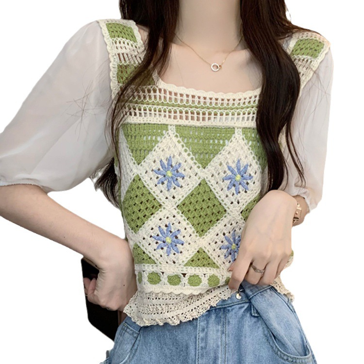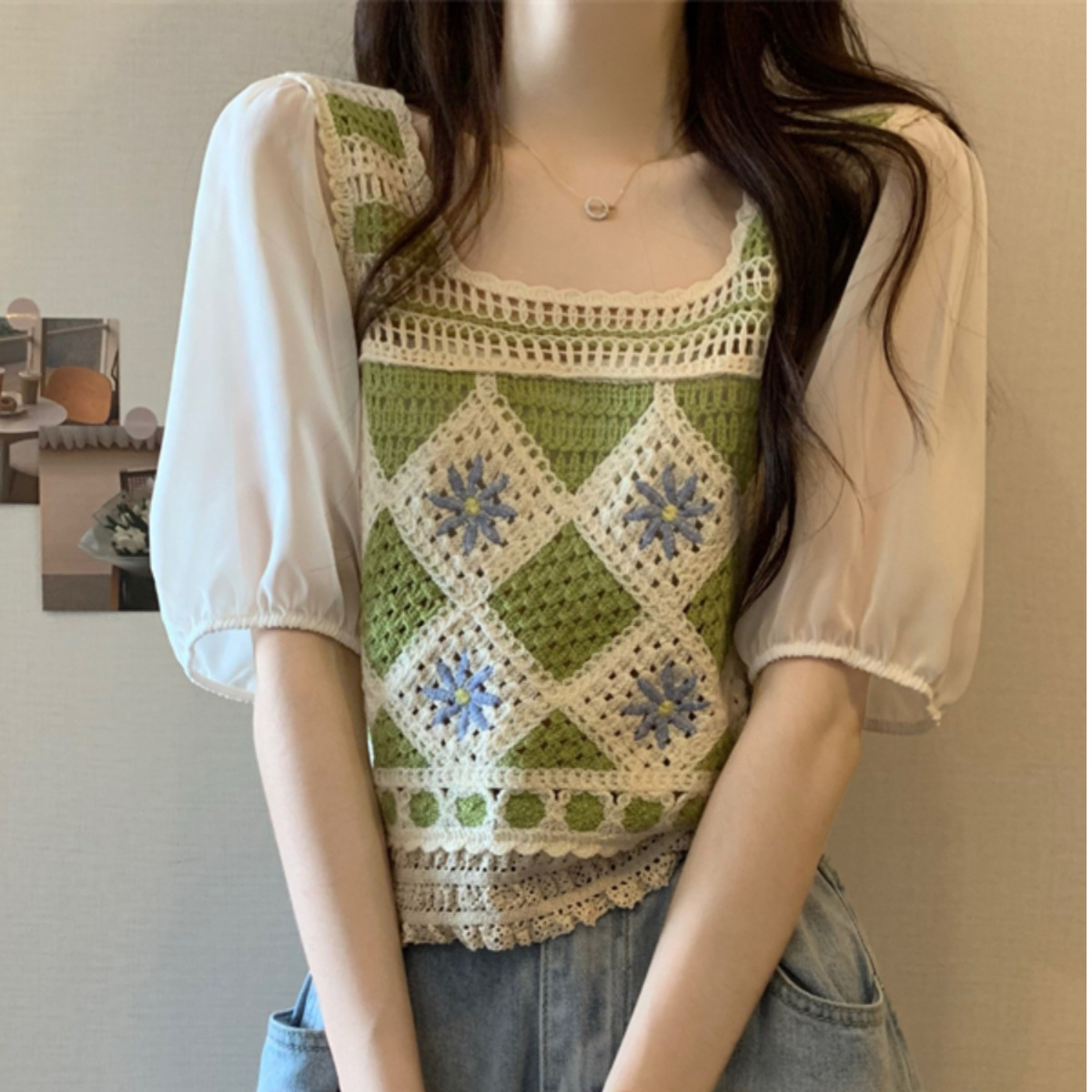 韩风设计感泡泡袖拼接钩花镂空短袖女夏季小个子别致小众短款上衣