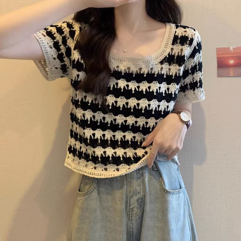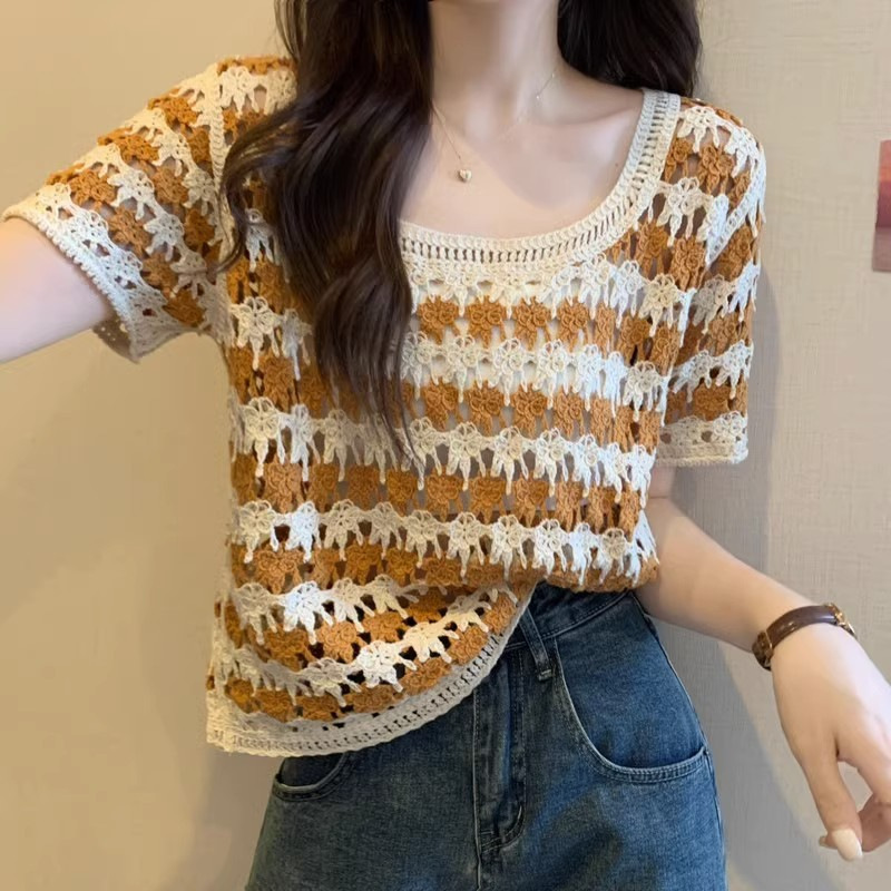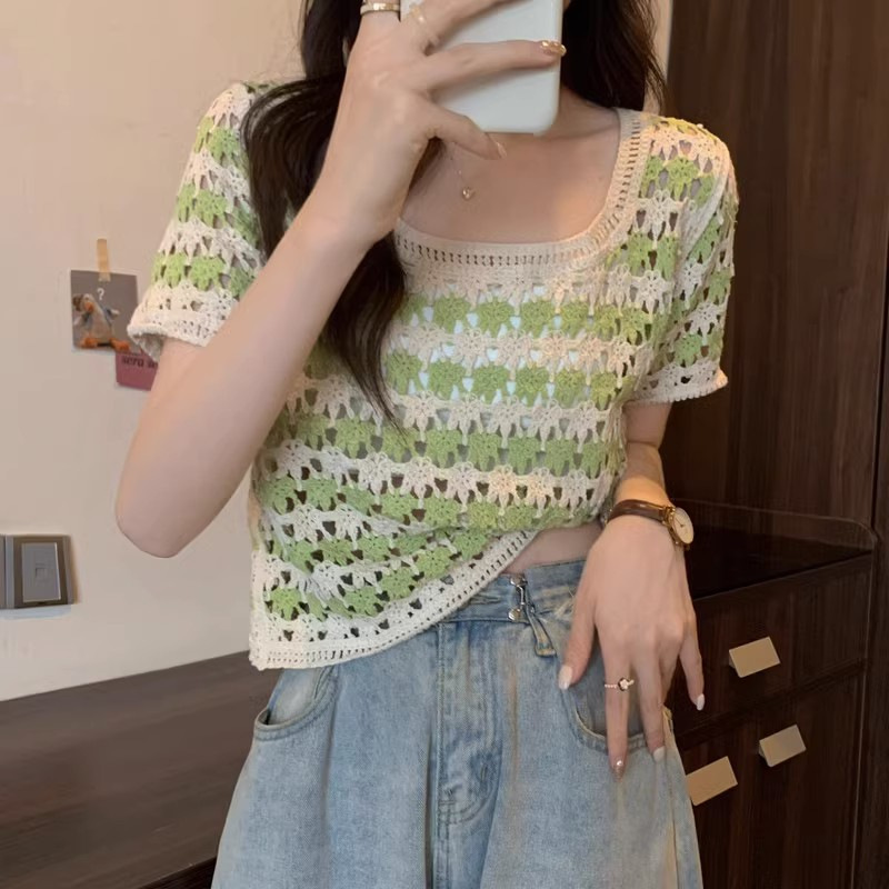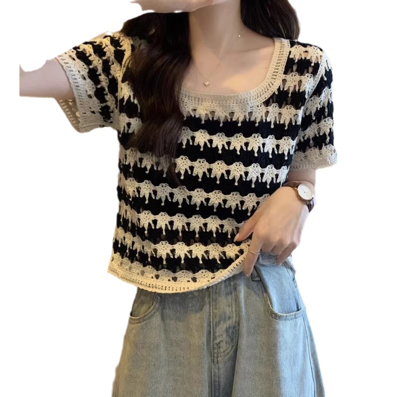 夏季新款韩版短袖U领设计感甜酷女孩范镂空钩花短款针织上衣女潮
