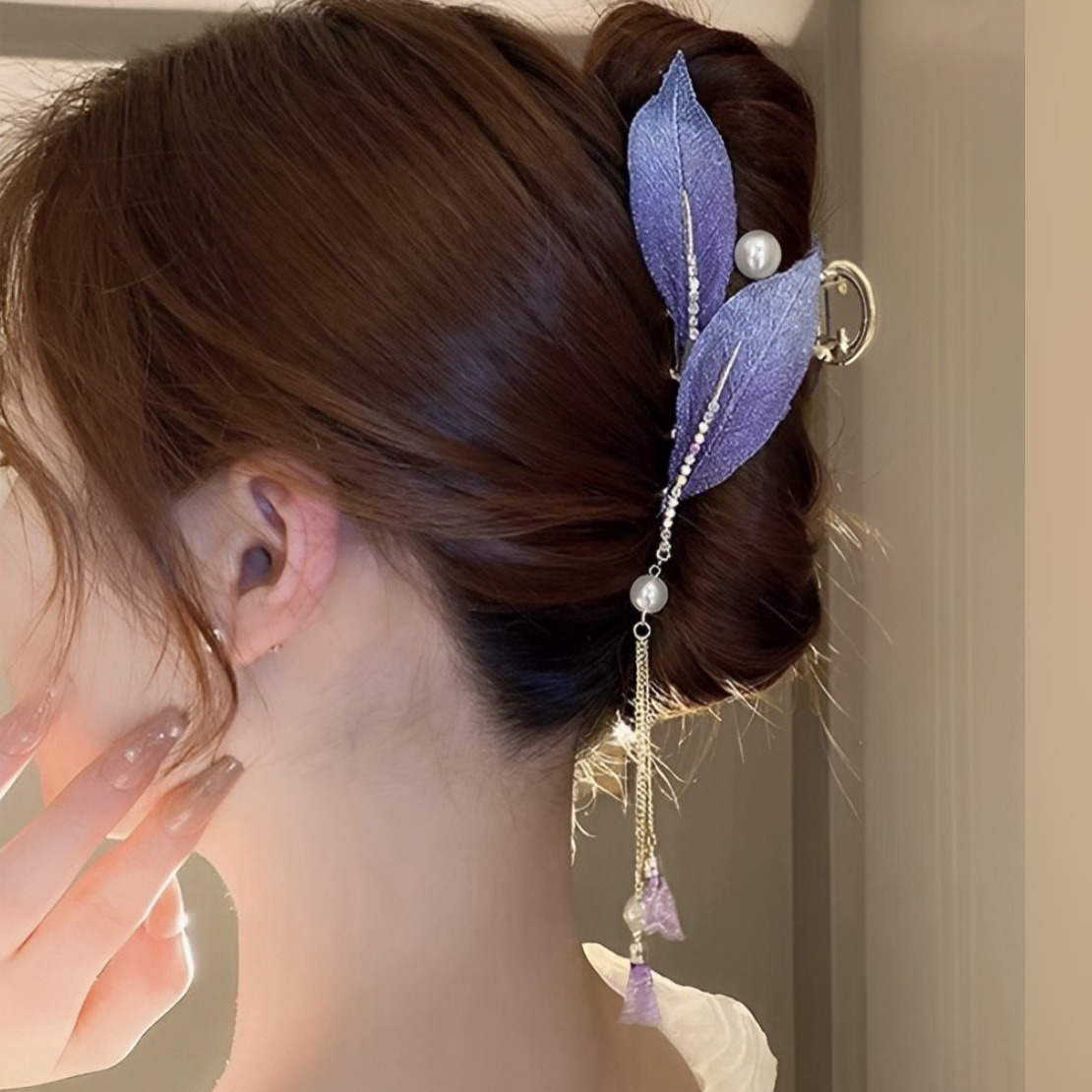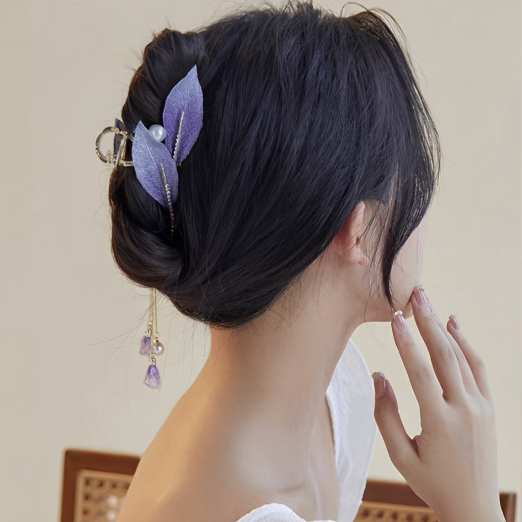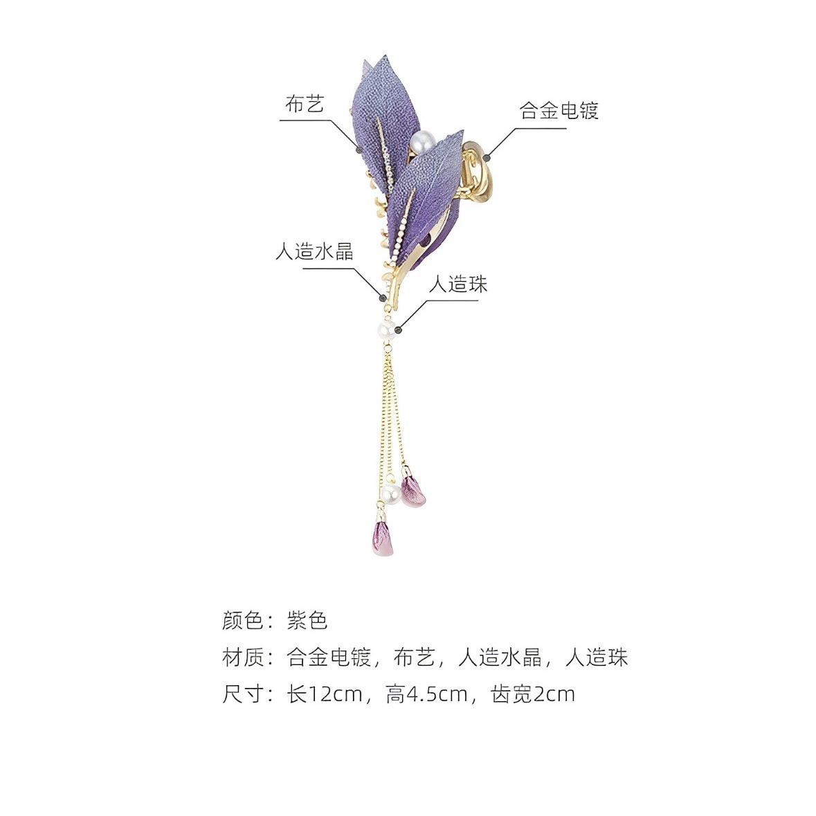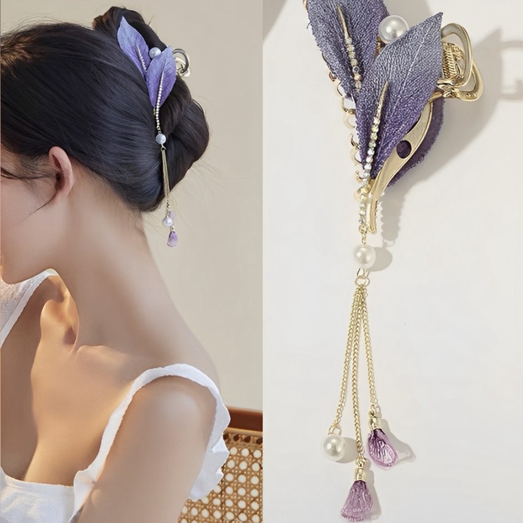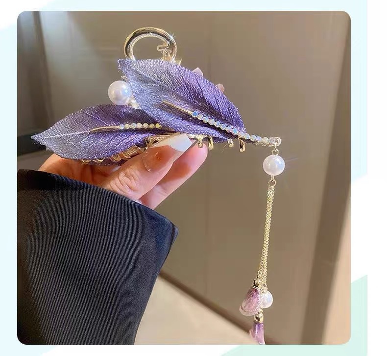 大号紫色树叶珍珠流苏抓夹女新款夏后脑勺鲨鱼夹古风盘发发夹