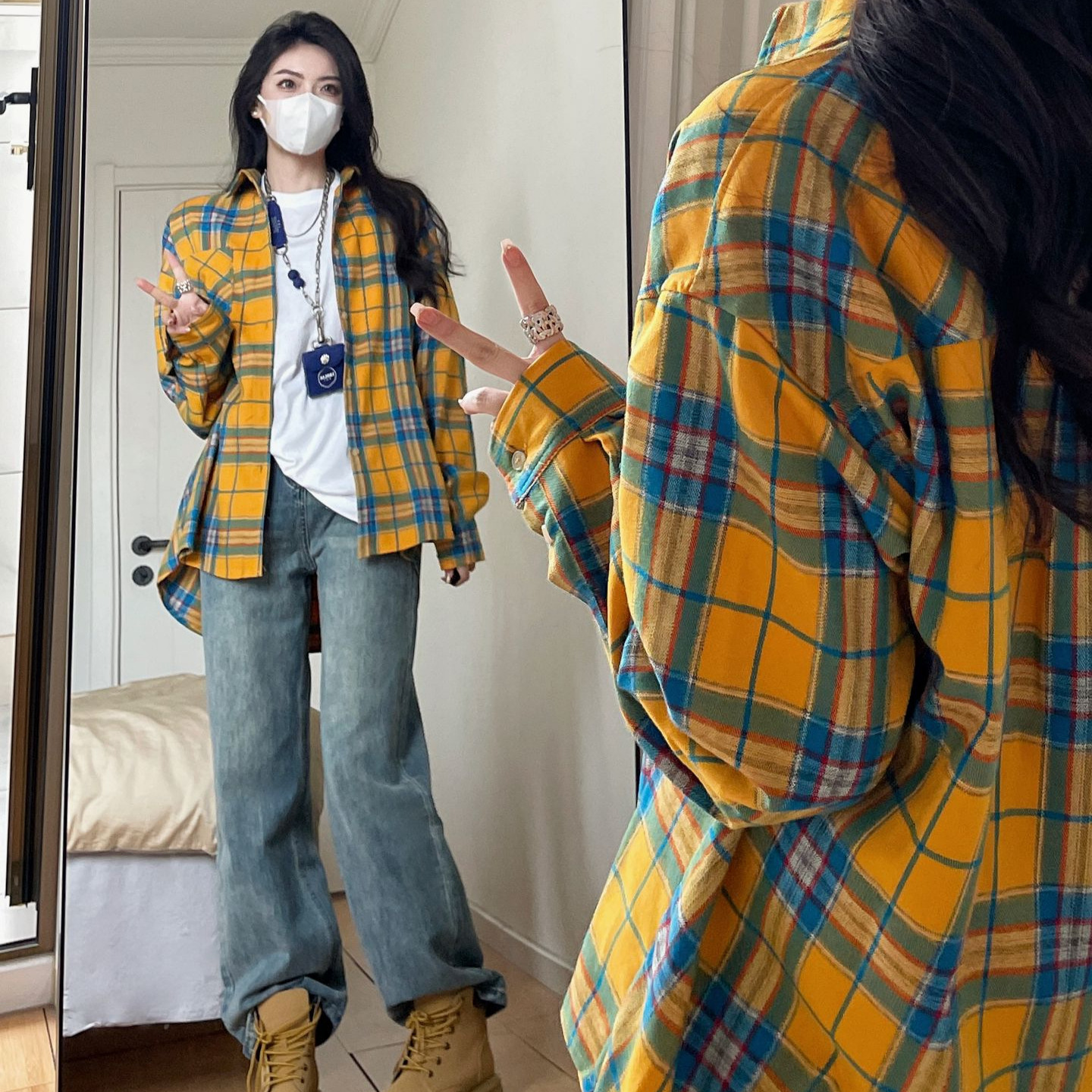 法式黄色格子衬衫衬衣外套女春秋季新款小个子内搭长袖上衣