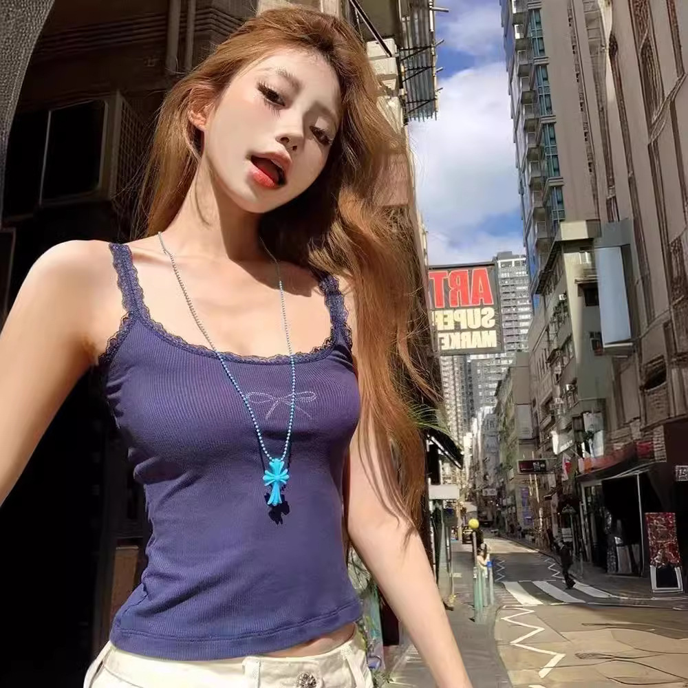蕾丝花边烫钻吊带背心女夏季甜辣妹紧身短款内搭小众清纯上衣外穿