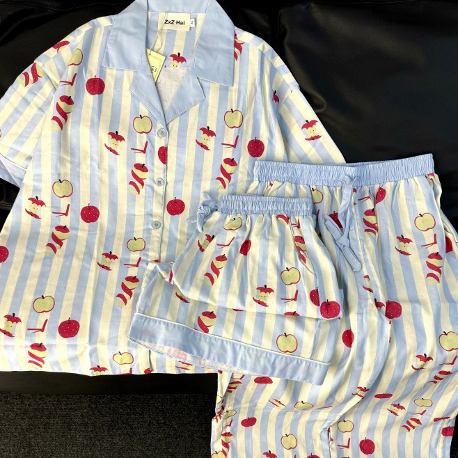 春夏款卡通可爱纯棉短袖短裤长裤睡衣三件套翻领休闲可外穿家居服