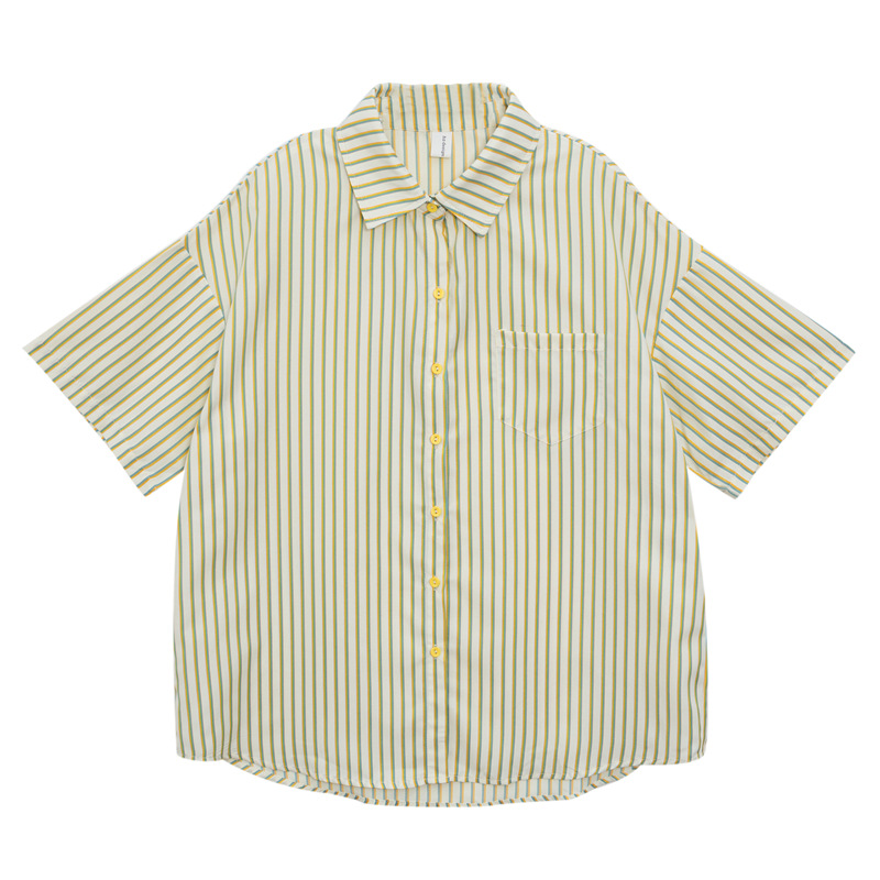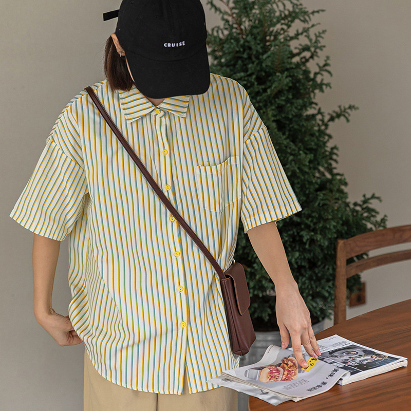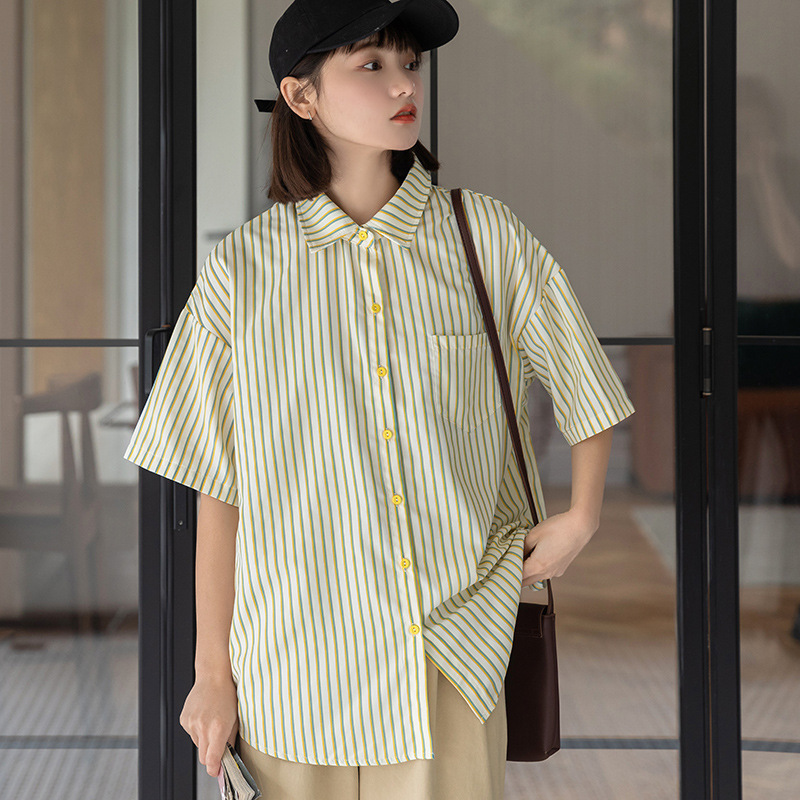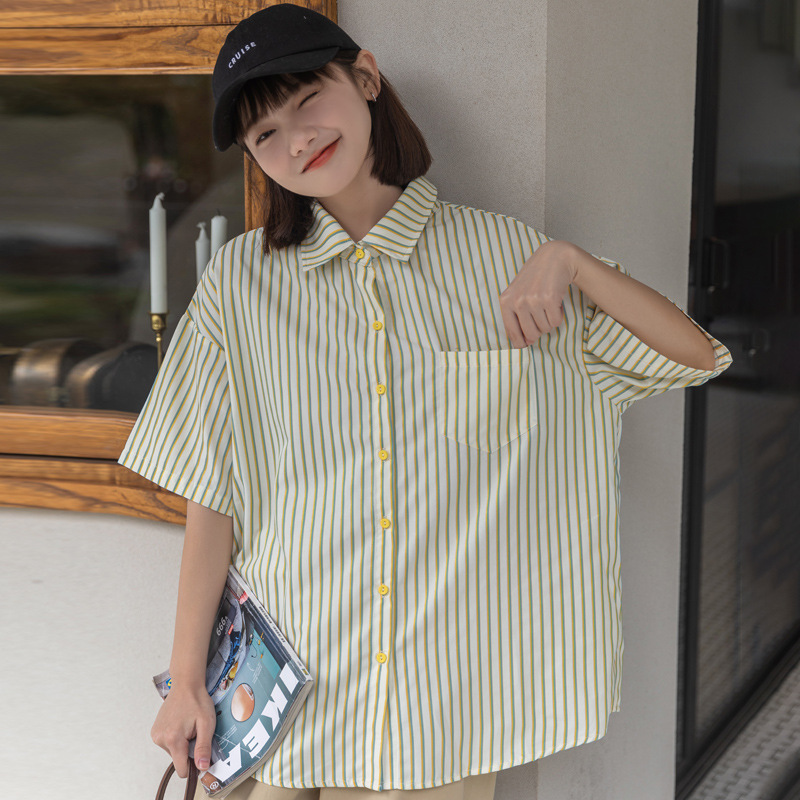 条纹短袖衬衫女夏季新款日系宽松中长款休闲开衫衬衣