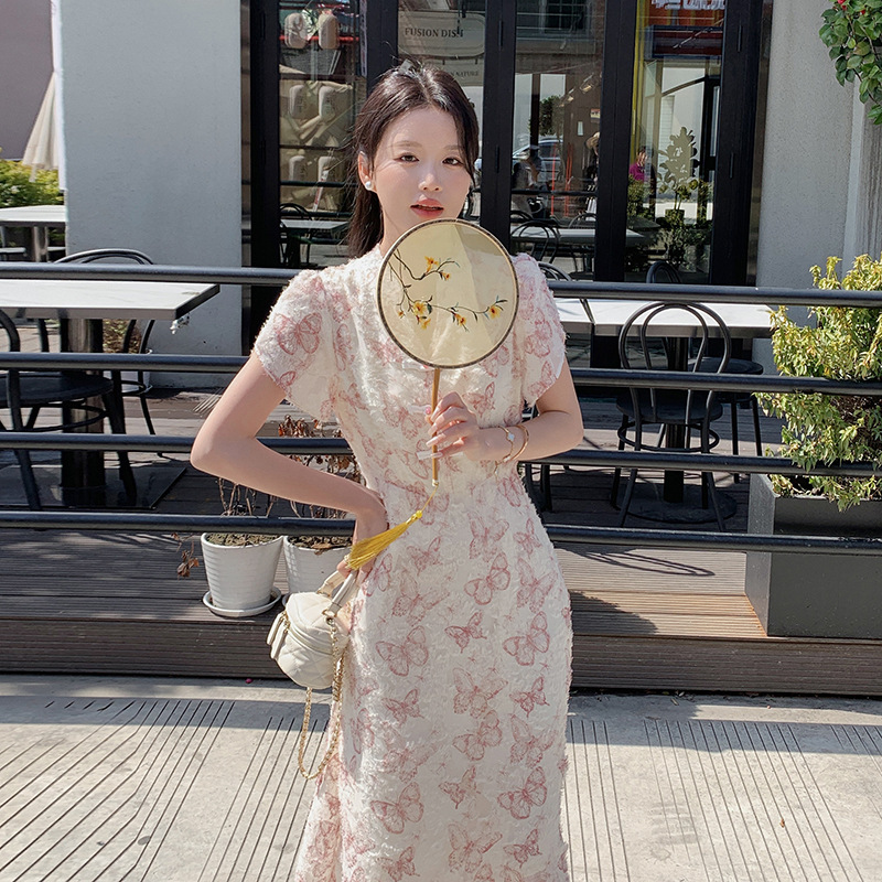 新款玲珑水墨印染国风心短袖露肩长款设计款新中盘扣连衣裙