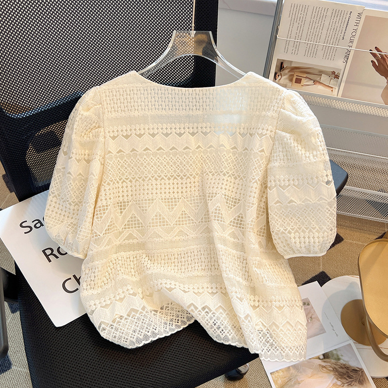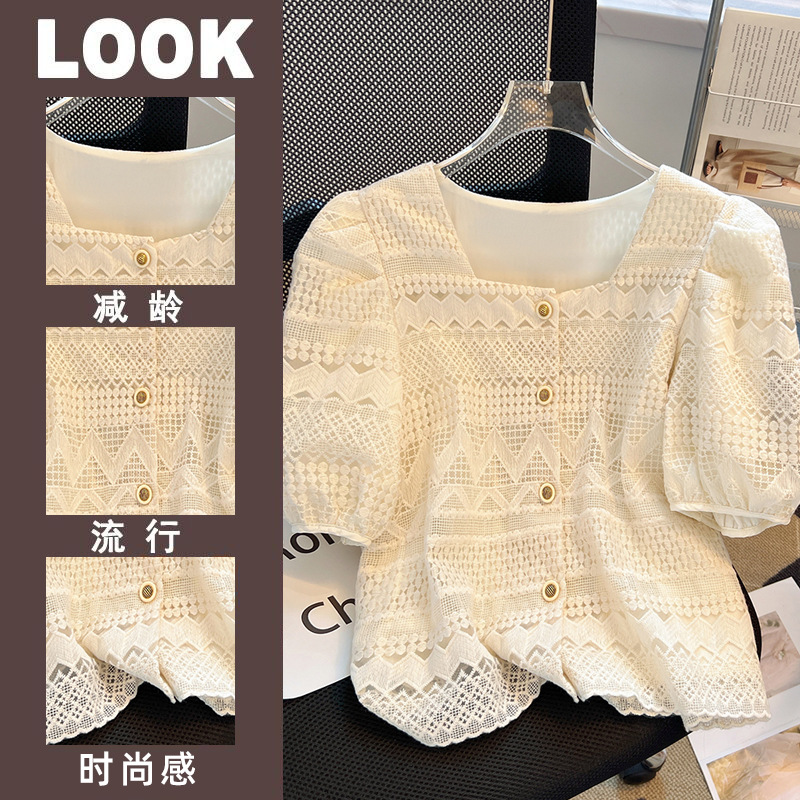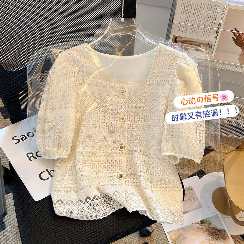 小香风重工镂空蕾丝小衫女夏季新款泡泡短袖气质显瘦方领衬衣
