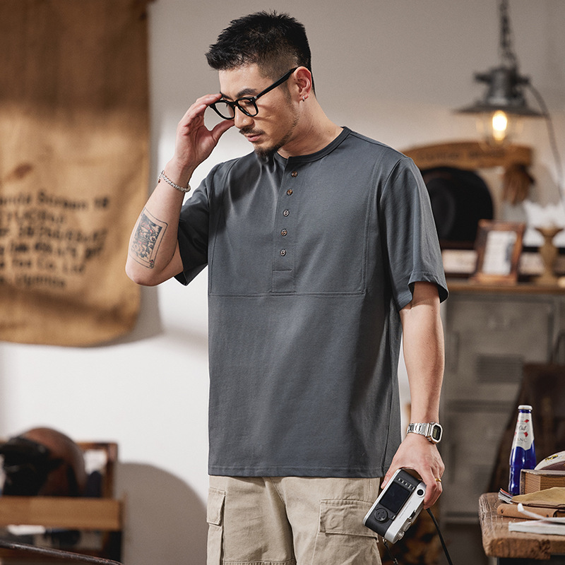 高端美式亨利领拼接短袖T恤男士多纽扣夏季潮牌复古宽松240g体恤