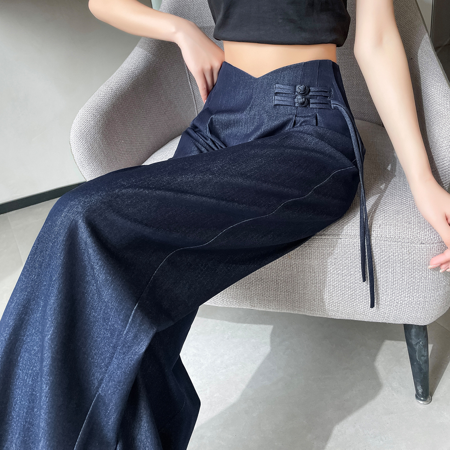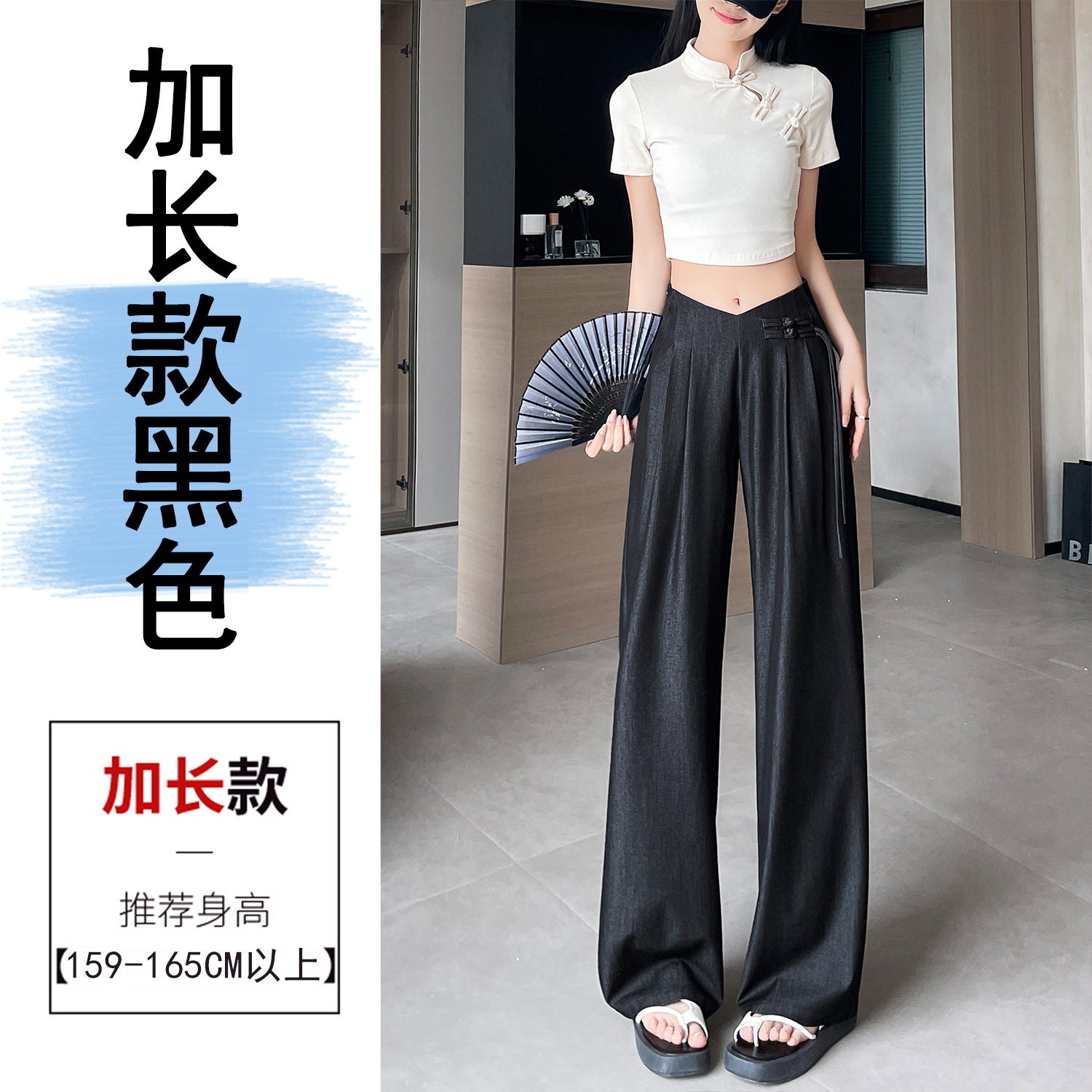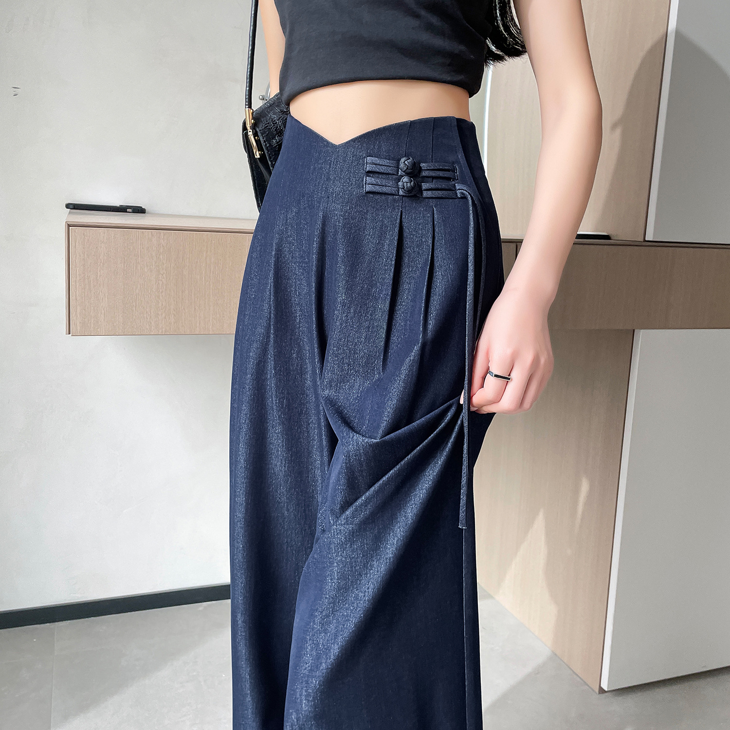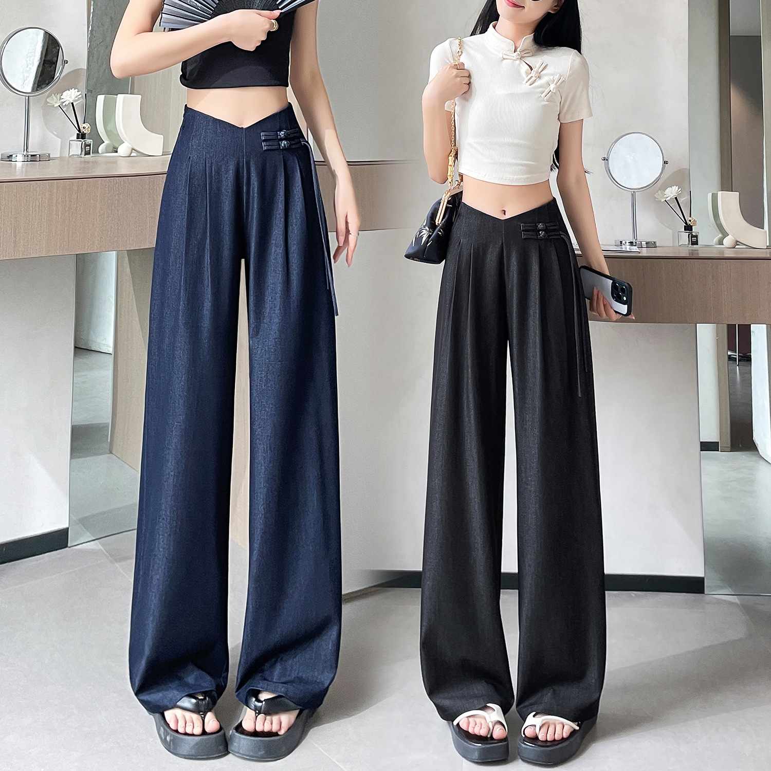 新中式天丝牛仔裤女夏季薄款高腰垂感国风盘扣窄版直筒西装阔腿裤
